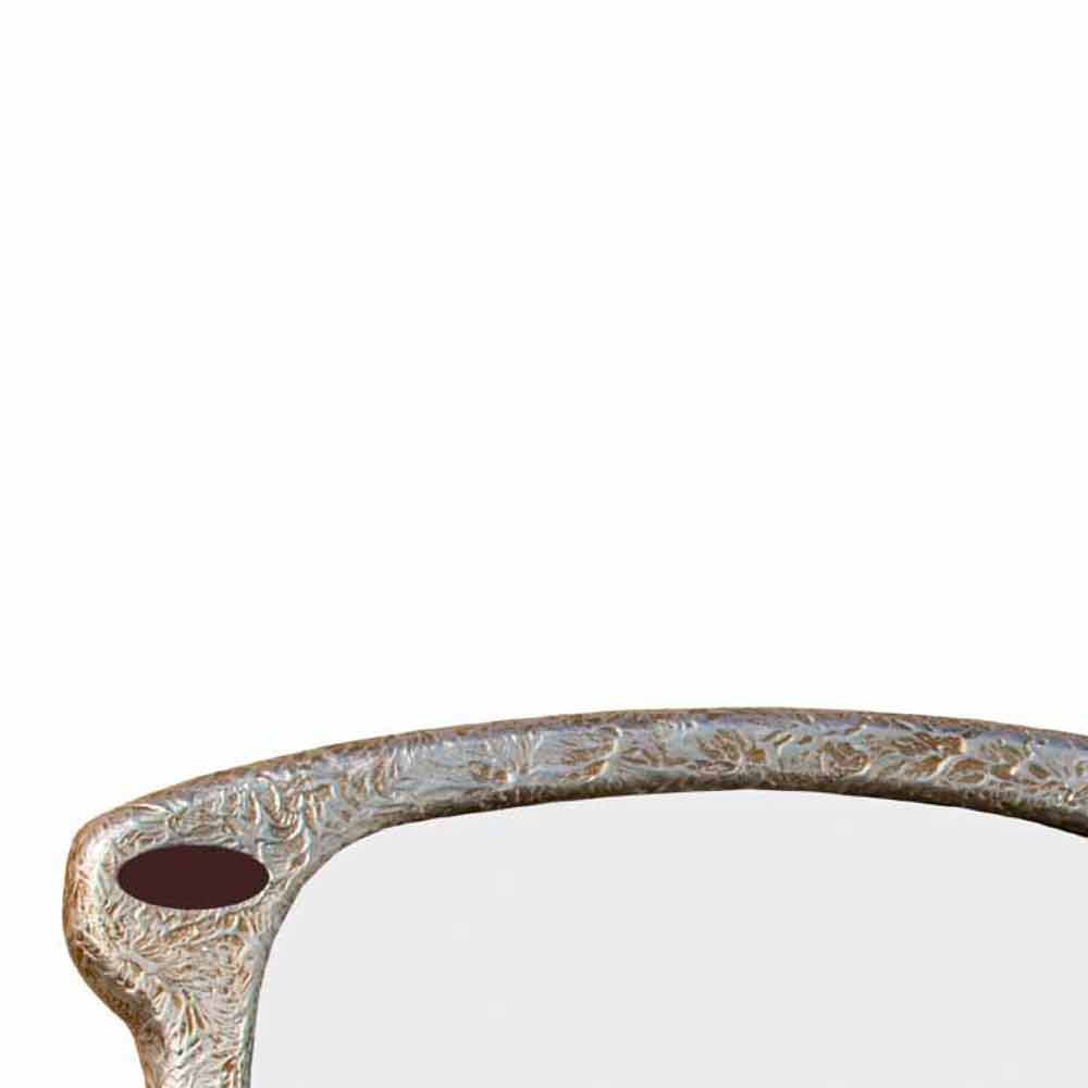 Specchio caratterizzato da grande stile ed eleganza. Realizzato in Mdf, un materiale molto resistente e inalterabile nel tempo, con struttura sagomata e decorata a mano con foglia argento su lavorazione materica in rilievo, piacevole al tatto e gradevole da vedere.