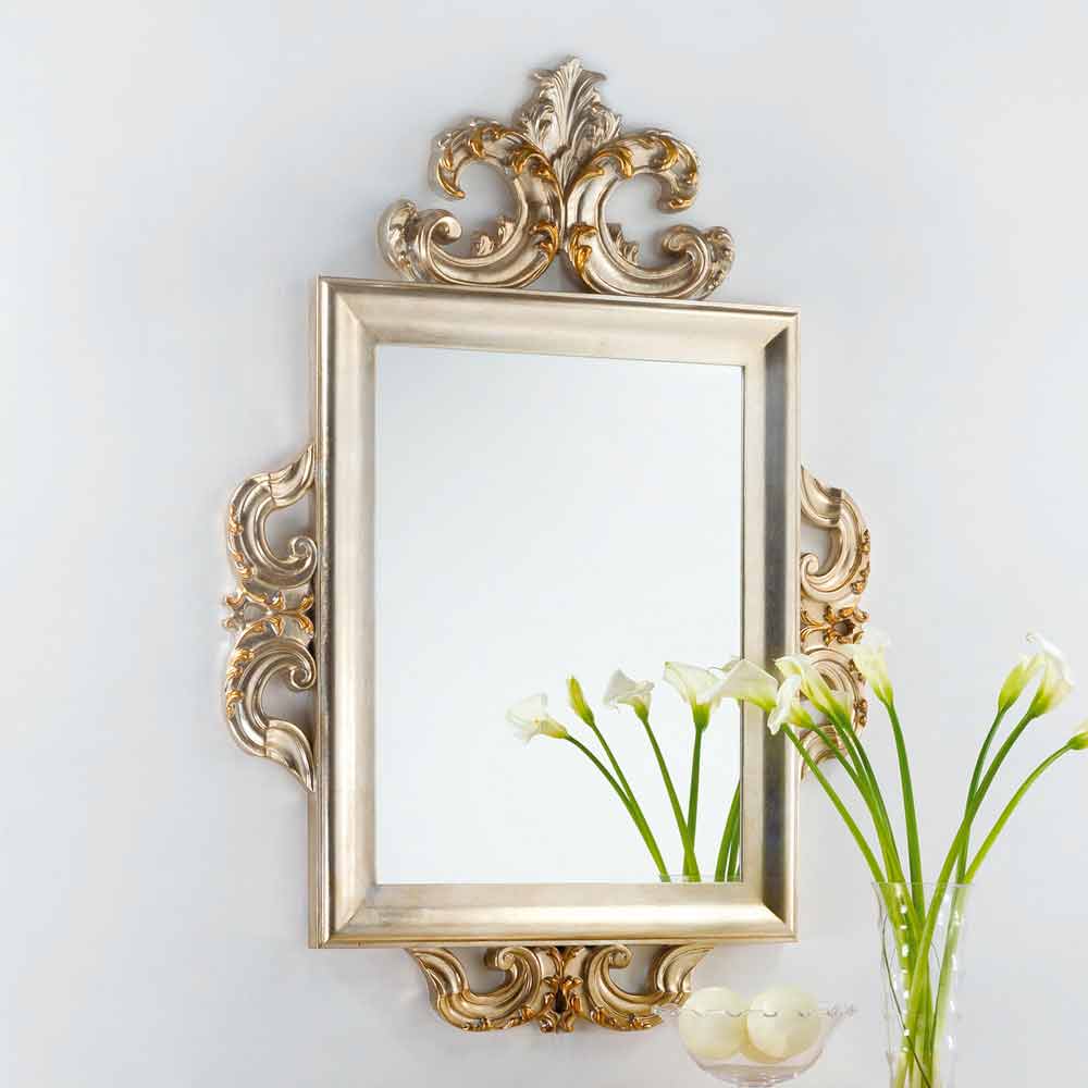 La specchiera Guy è caratterizzata da una lavorazione artigianale effettuata utilizzando materiali di pregio e servendosi dell'esperienza di abili artigiani italiani. La cornice è realizzata in legno decorato con intagli. Finitura foglia argento mecca. Specchio in cristallo, spessore 4mm. Made in Italy.