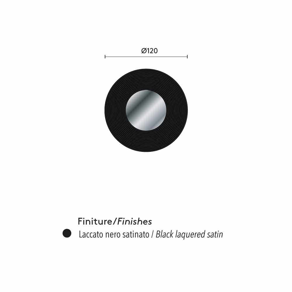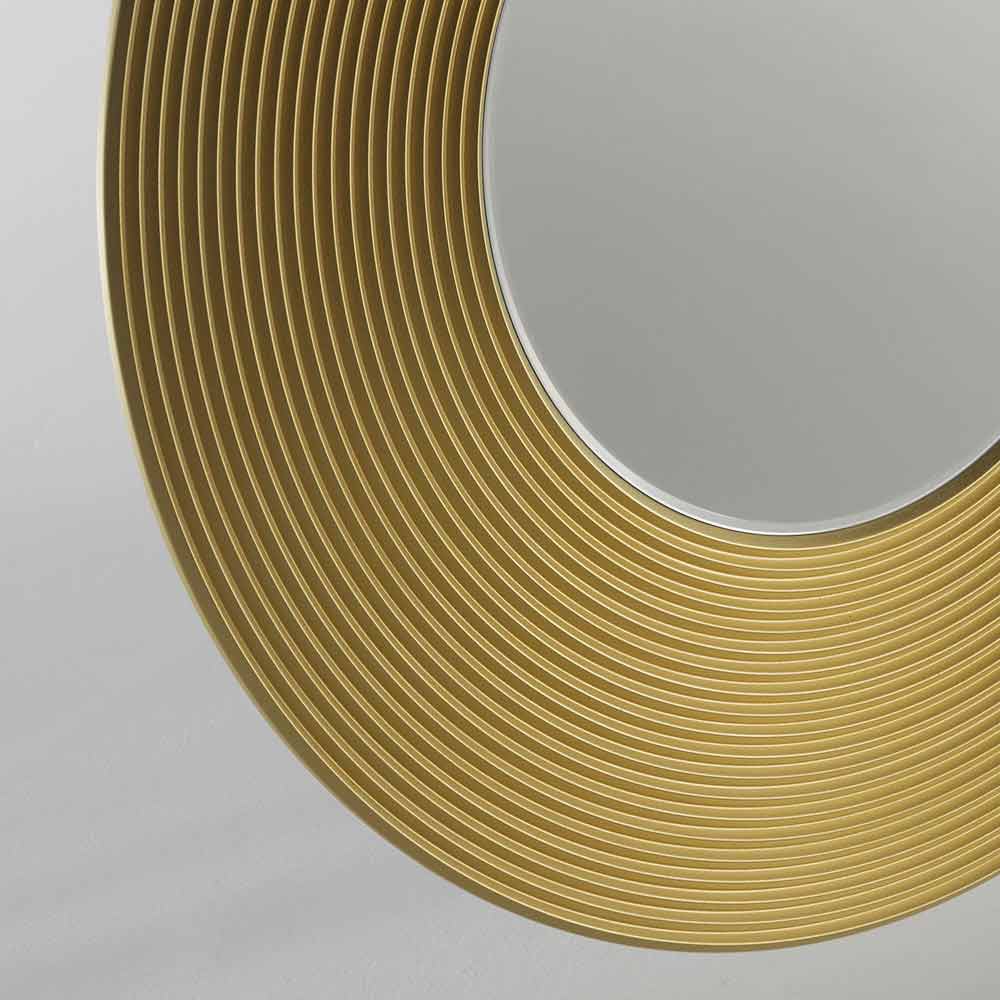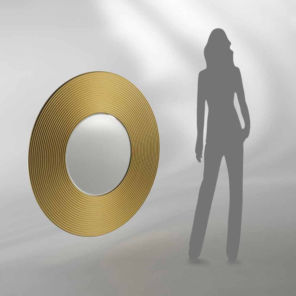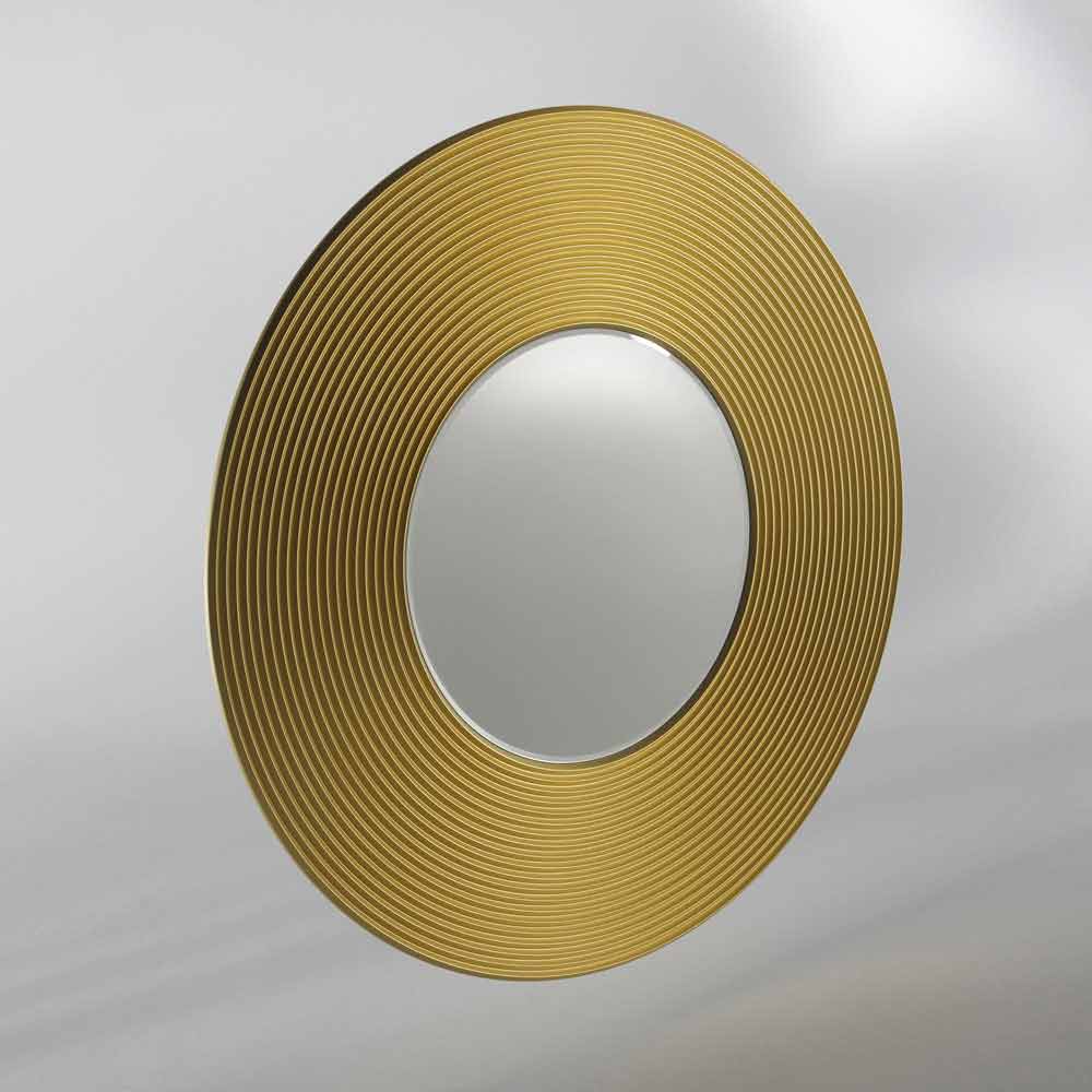 Specchio di design con supporto in MDF laccato oro, bianco satinato oppure nero satinato. Specchio centrale, decoro esterno.