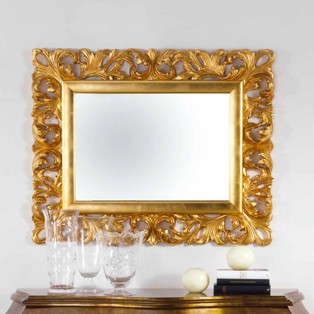 La specchiera Gudin è caratterizzata da una lavorazione artigianale effettuata utilizzando materiali di pregio e servendosi dell'esperienza di abili artigiani italiani. La cornice è realizzata in legno decorato con intagli. Finitura foglia oro. Specchio in cristallo, spessore 4mm. Made in Italy. Da appendere sia orizzontale che verticale.