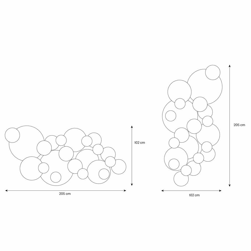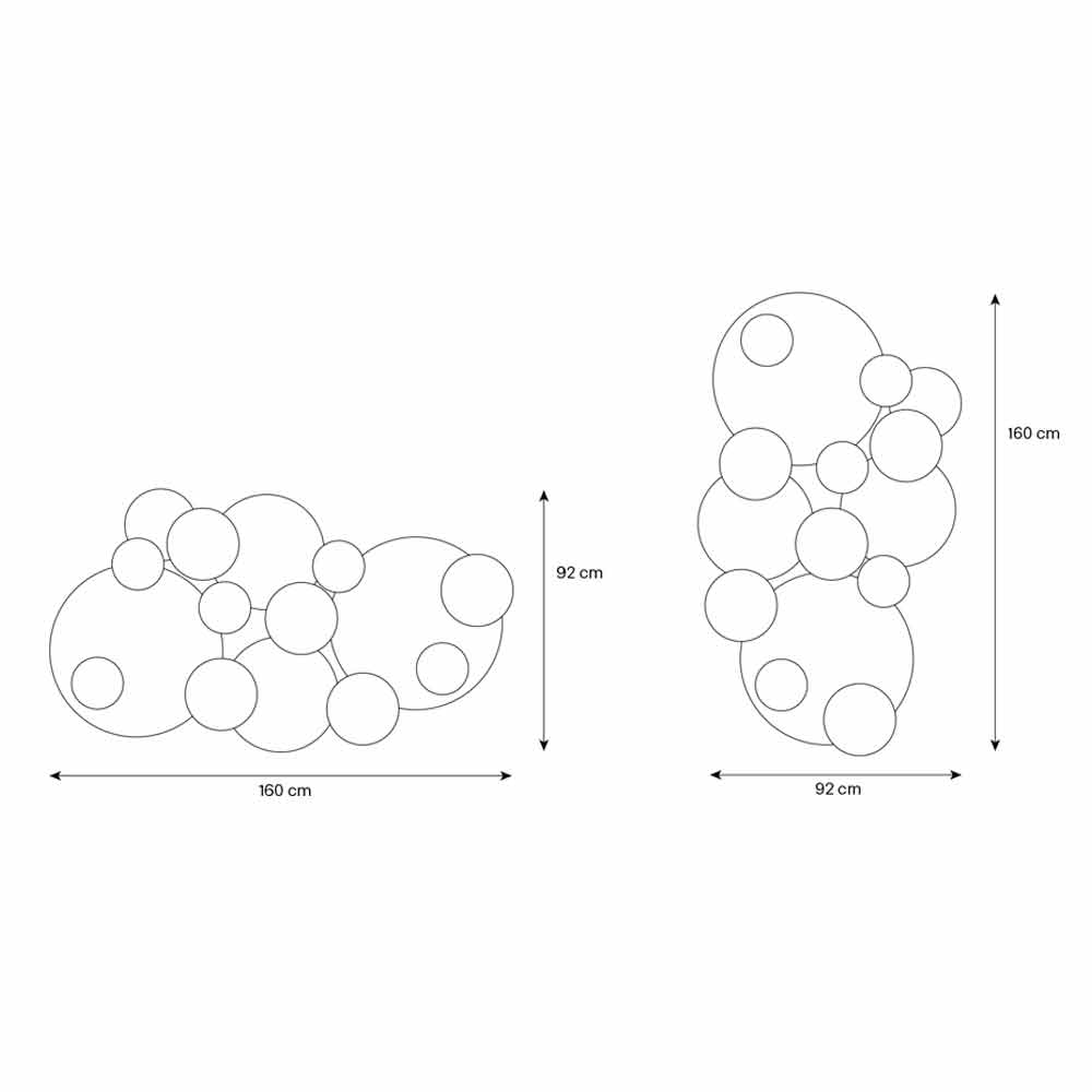 La specchiera a parete è composta da una serie di elementi circolari a specchio di diverse dimensioni ed in diverse finiture: specchio, fumè, bronzo, oro, rosa e grigio.