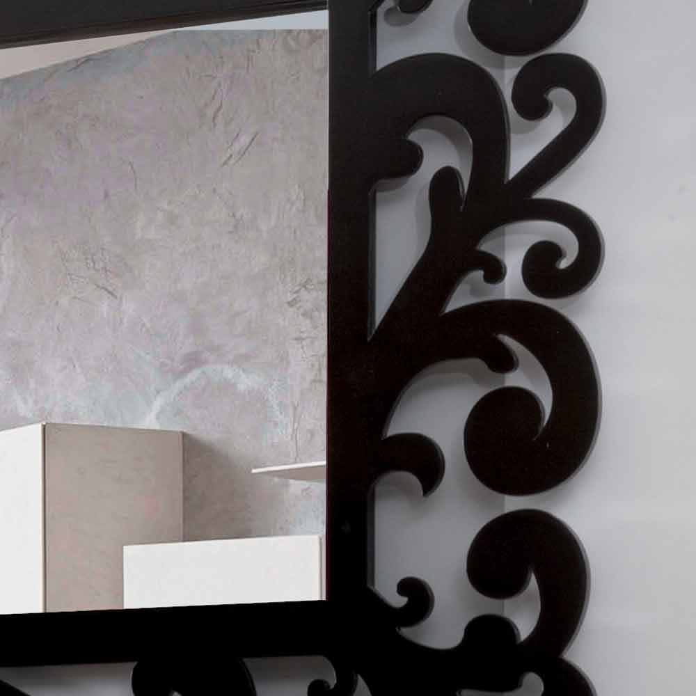 Specchiera in legno nero lucido dal design rettangolare a parete con cornice decorata, made in Italy.