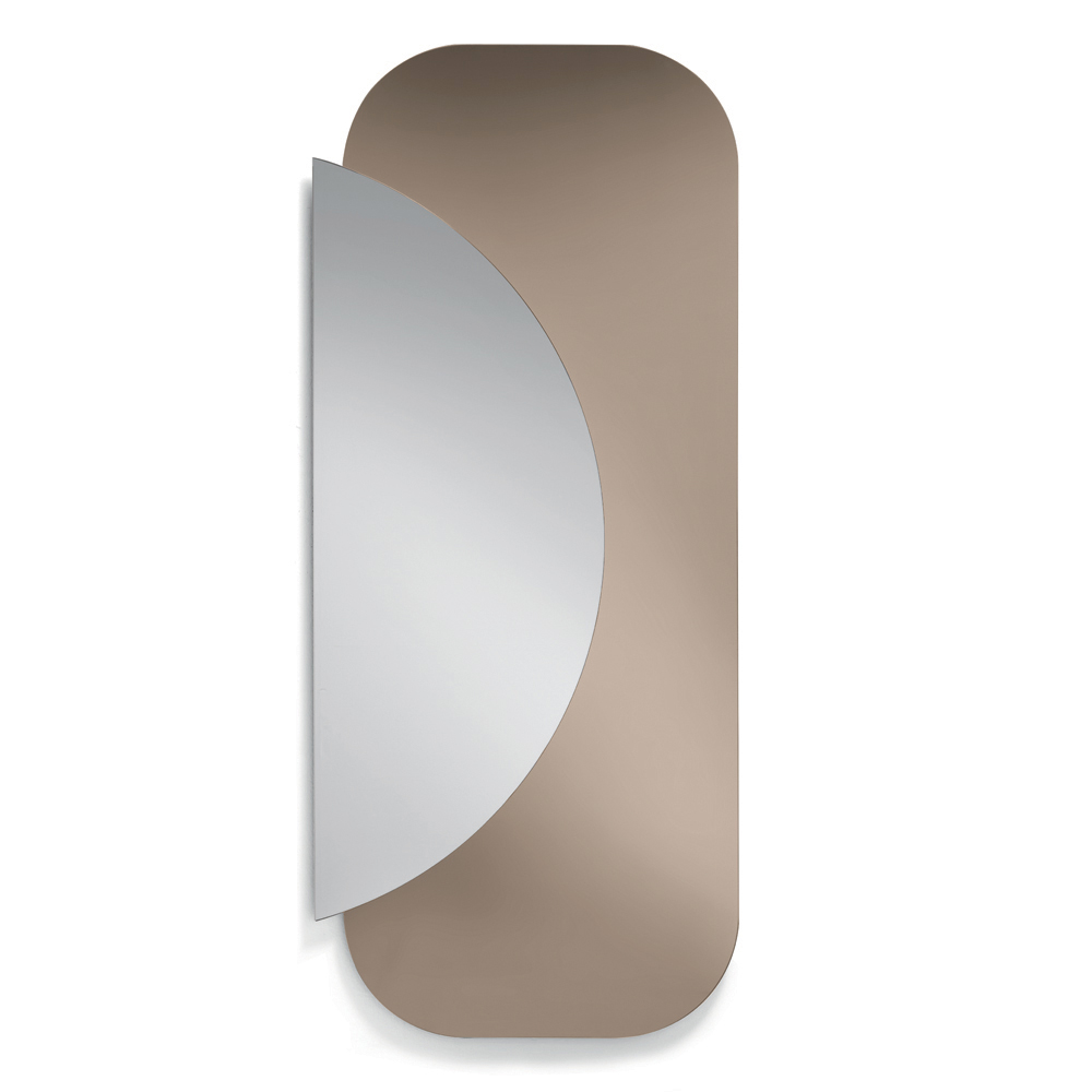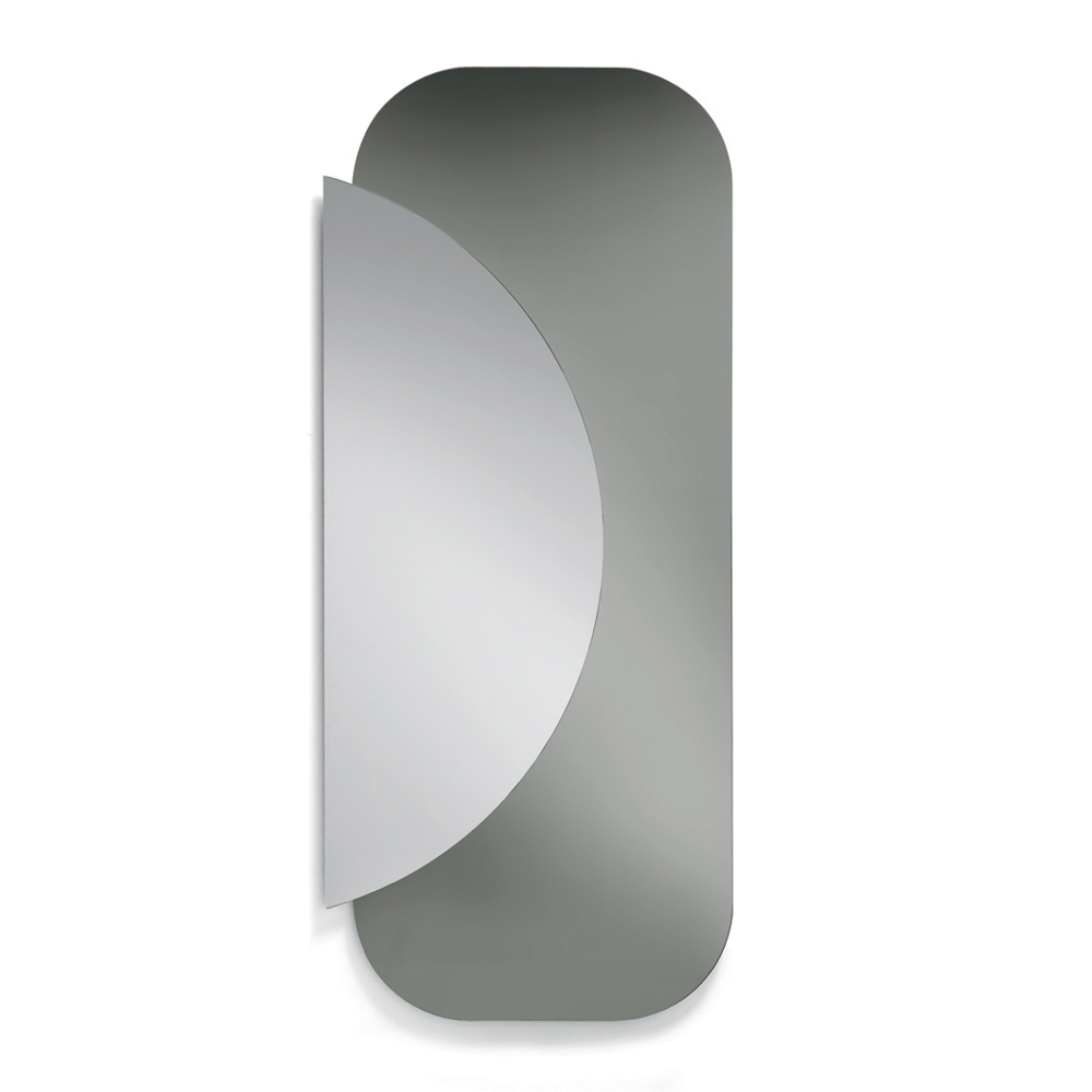 La composizione è formata da due lastre sagomate sovrapposte: una base rettangolare con angoli morbidi e un semicerchio in specchio naturale che si sovrappone creando un elegante dialogo tra geometrie e riflessi. Questo contrasto tra forme e materiali genera un effetto visivo dinamico e contemporaneo.
