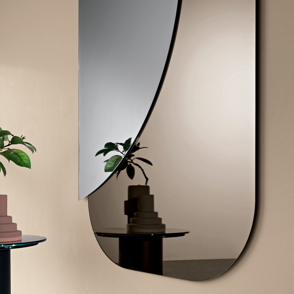 Elegante specchio sagomato di design Made in Italy, ideale per valorizzare con stile ambienti come ingresso, soggiorno o zona notte. Il suo design moderno si distingue per un raffinato gioco di forme sovrapposte che dona profondità e carattere alla parete.