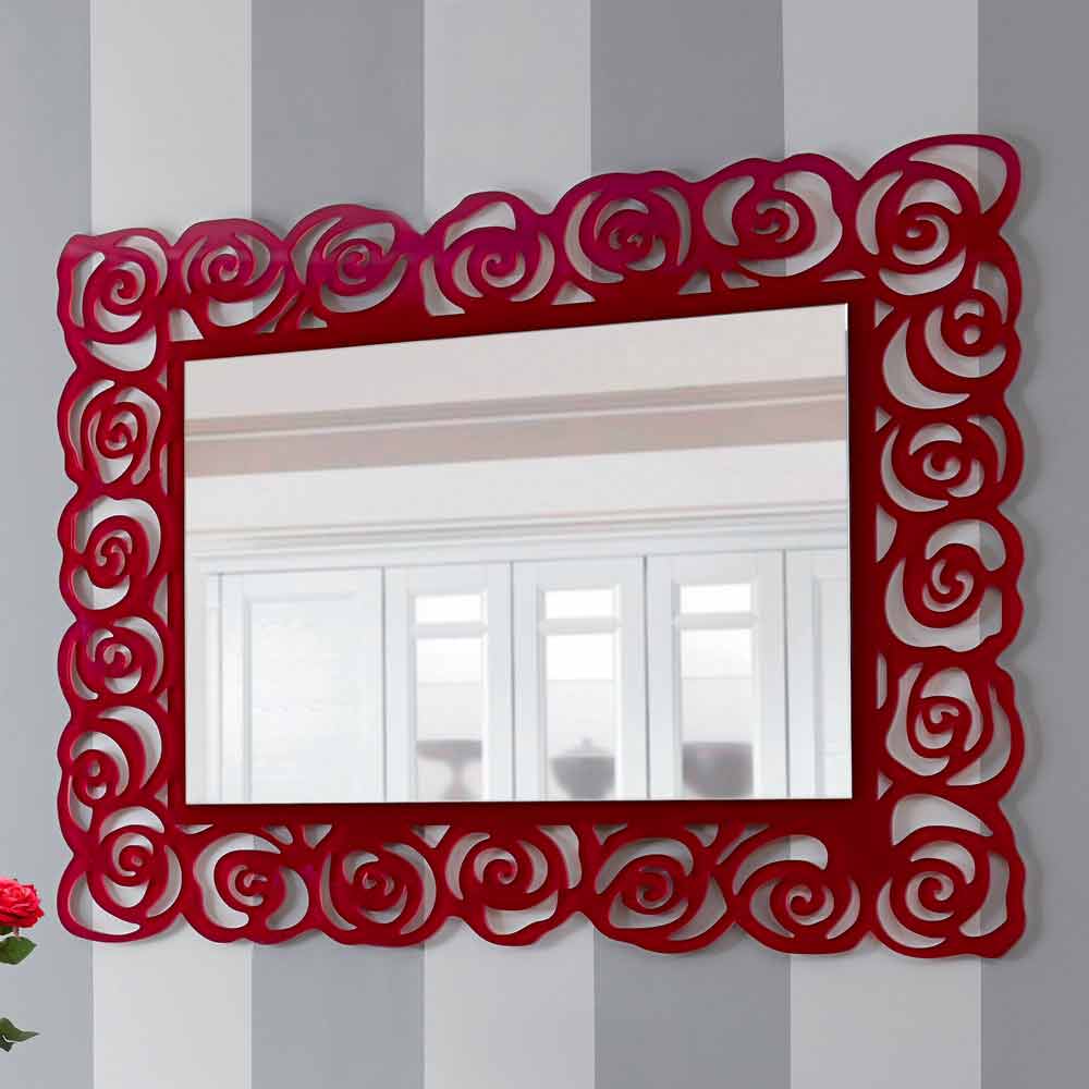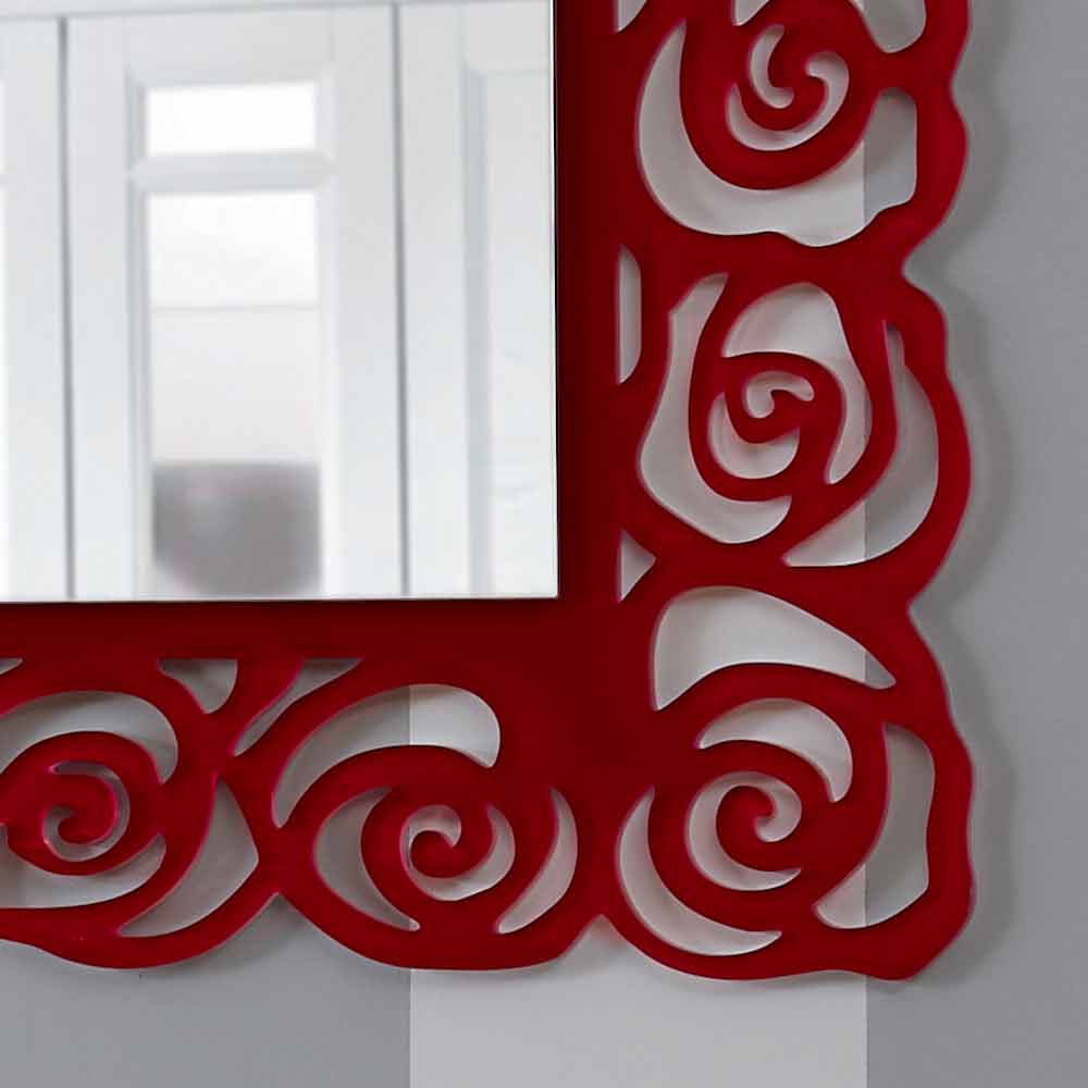 Specchiera di design moderno ed elegante rettangolare, con cornice di rose in plexiglass rosso, made in Italy.