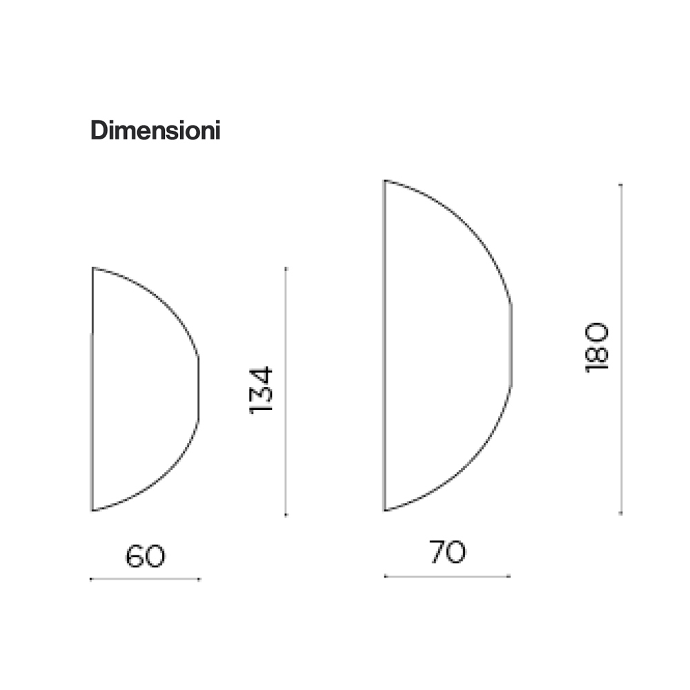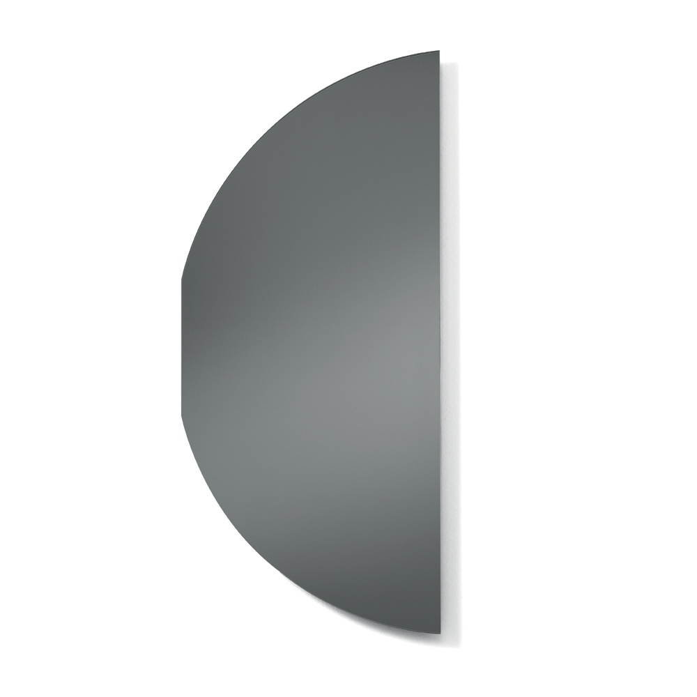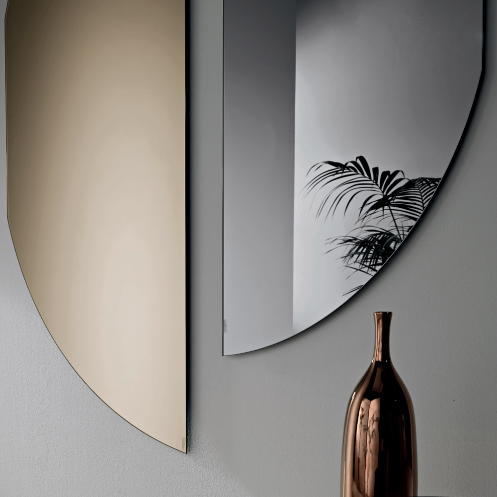 Lo specchio presenta una forma sagomata che richiama un semicerchio con curva interrotta, creando una silhouette originale e armoniosa. Questa geometria essenziale dona allo specchio una forte presenza visiva pur mantenendo un’estetica minimalista e raffinata.