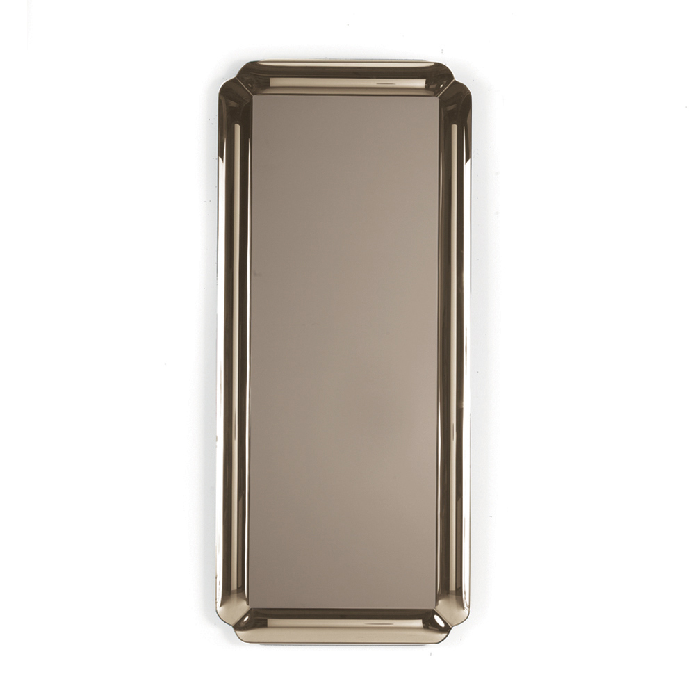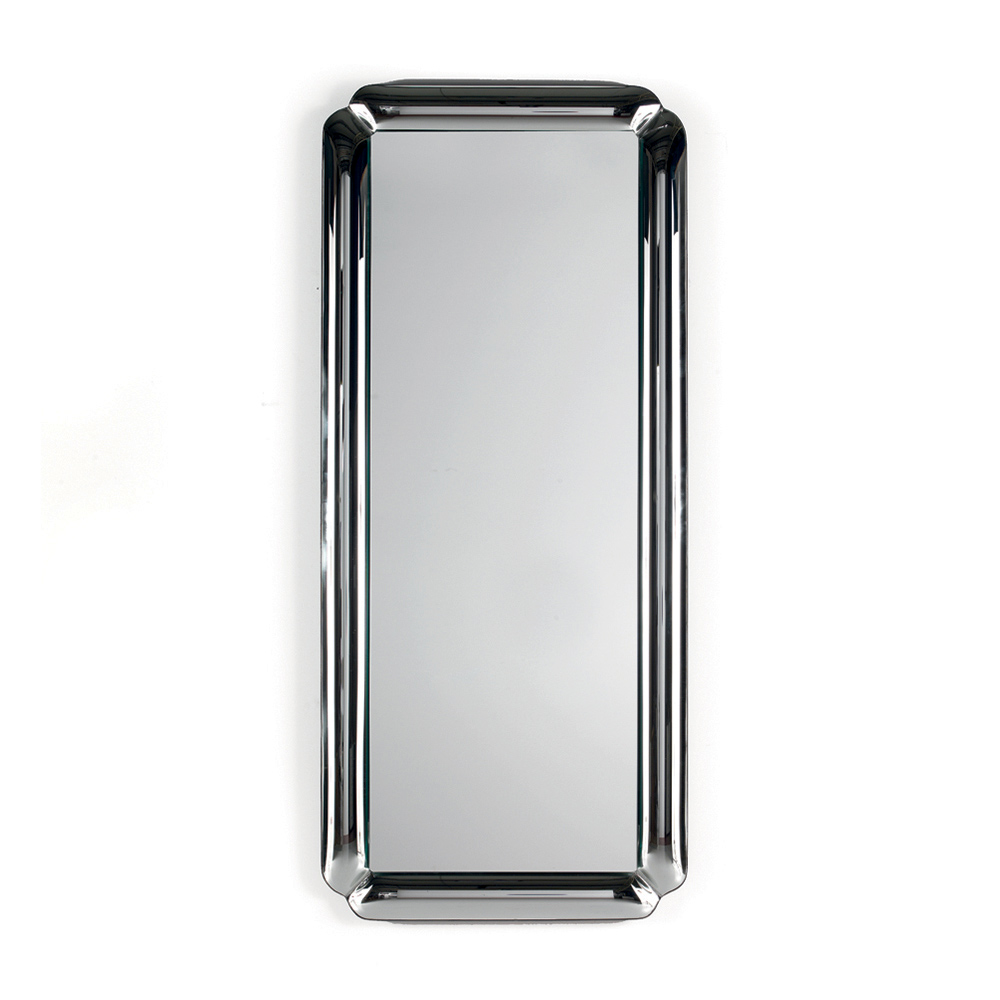 Lo specchio presenta una forma rettangolare impreziosita da una cornice in cristallo fuso tono su tono con angoli delicatamente sagomati. La lastra riflettente è appoggiata sulla cornice creando un raffinato gioco di profondità che valorizza la superficie e dona leggerezza alla composizione.