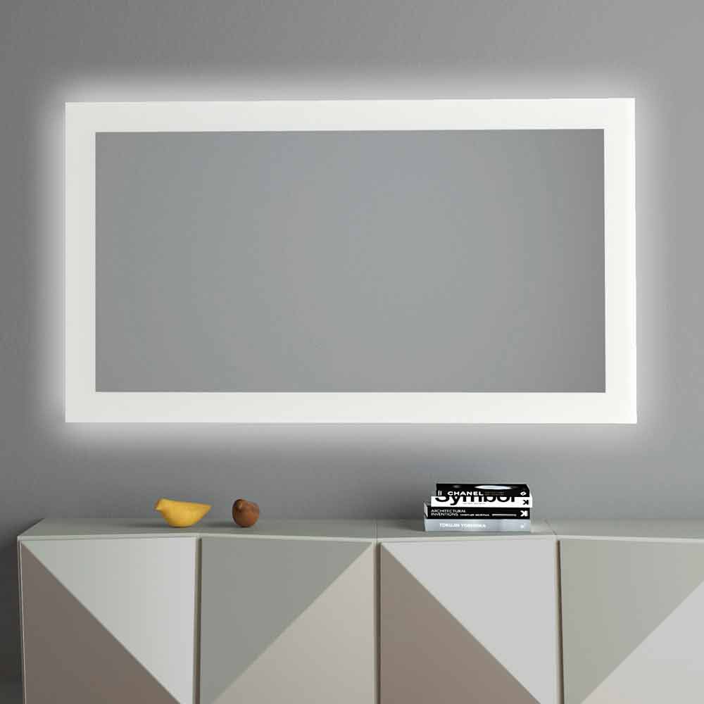 Specchio da parete rettangolare retroilluminato con cornice sabbiata Made in Italy.