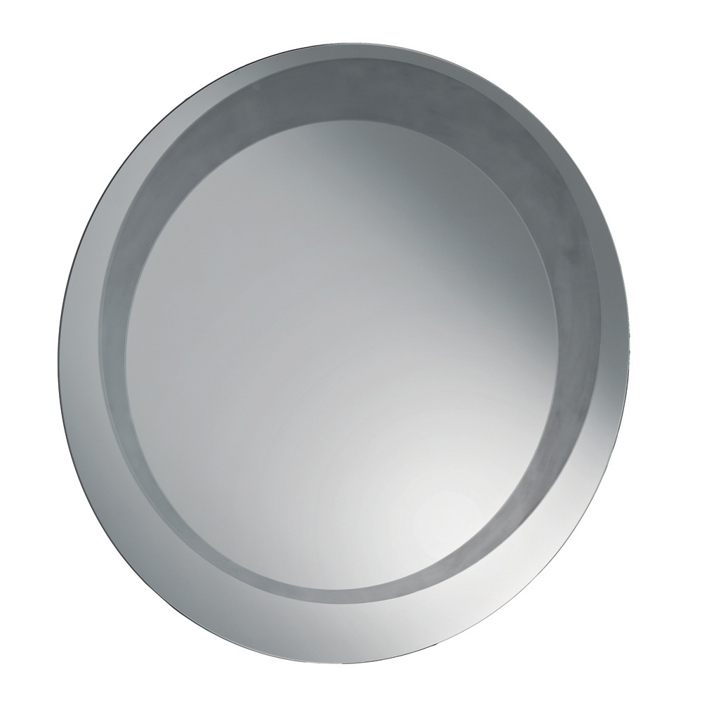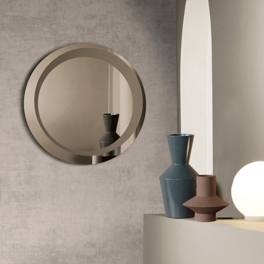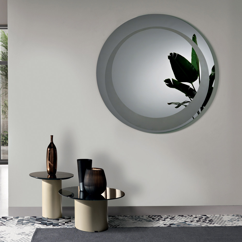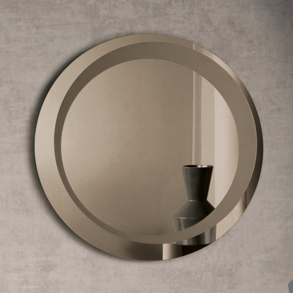 Lo specchio presenta una forma rotonda impreziosita da una decorazione sabbiata tono su tono che disegna un cerchio decentrato di spessore variabile. Questo dettaglio grafico crea un raffinato gioco di superfici e riflessi, aggiungendo profondità e personalità al design dello specchio.