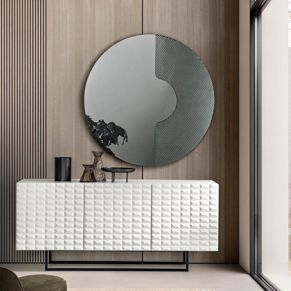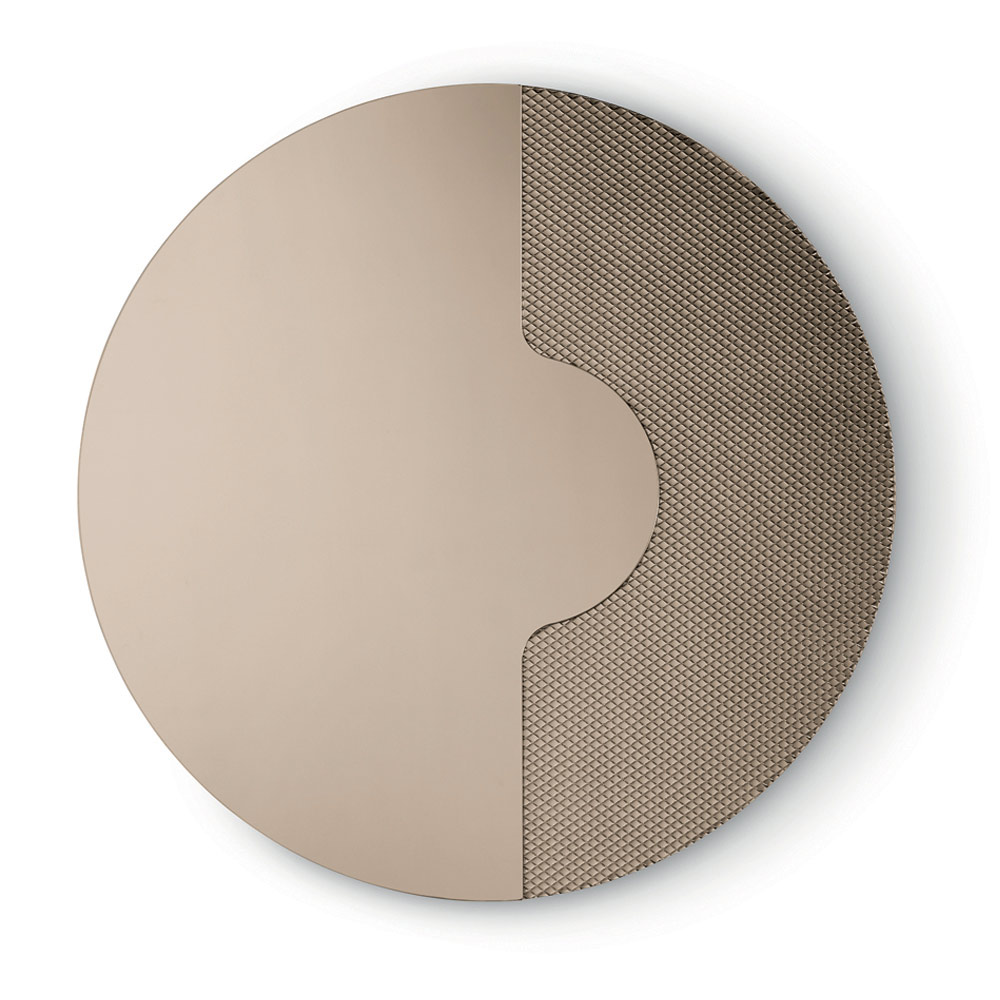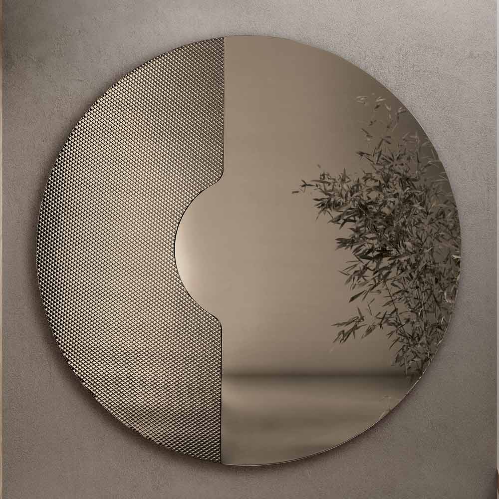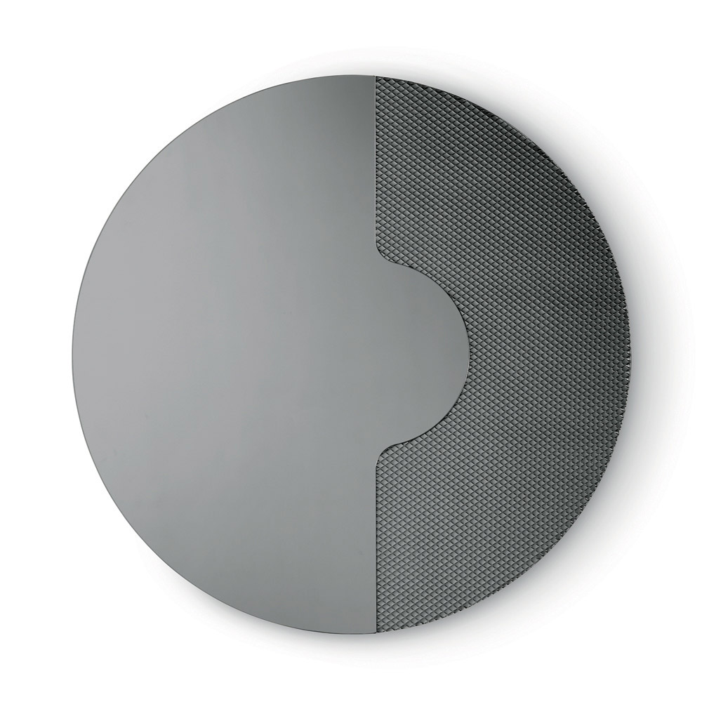 Lo specchio presenta una forma rotonda e si distingue per la presenza di un inserto laterale in vetro tono su tono inciso con una trama grafica a rete. Questo elemento decorativo accoglie la lastra specchiata come se fosse appoggiata su di esso, generando un raffinato effetto tridimensionale e un elegante gioco di spessori e riflessi.