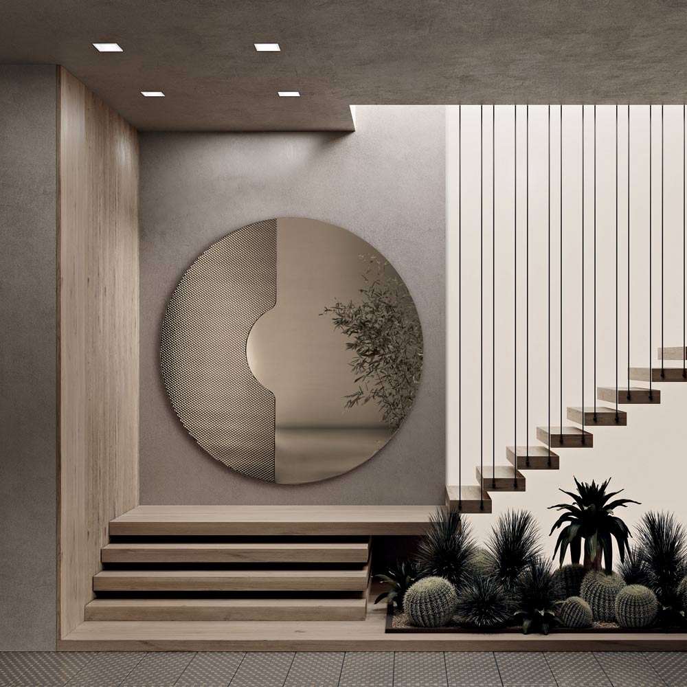 Grazie al suo equilibrio tra geometria e texture, questo specchio diventa un elemento decorativo sofisticato capace di aggiungere profondità e luminosità alla parete, adattandosi perfettamente ad ambienti moderni e contemporanei.