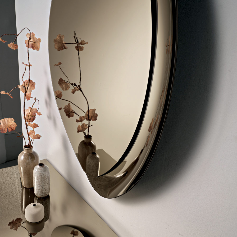 Il design è caratterizzato da una particolare semi-cornice in vetro fuso tono su tono che incornicia parzialmente la superficie riflettente. Questo dettaglio aggiunge matericità e luminosità, creando un suggestivo gioco di riflessi che dona profondità e carattere allo specchio.