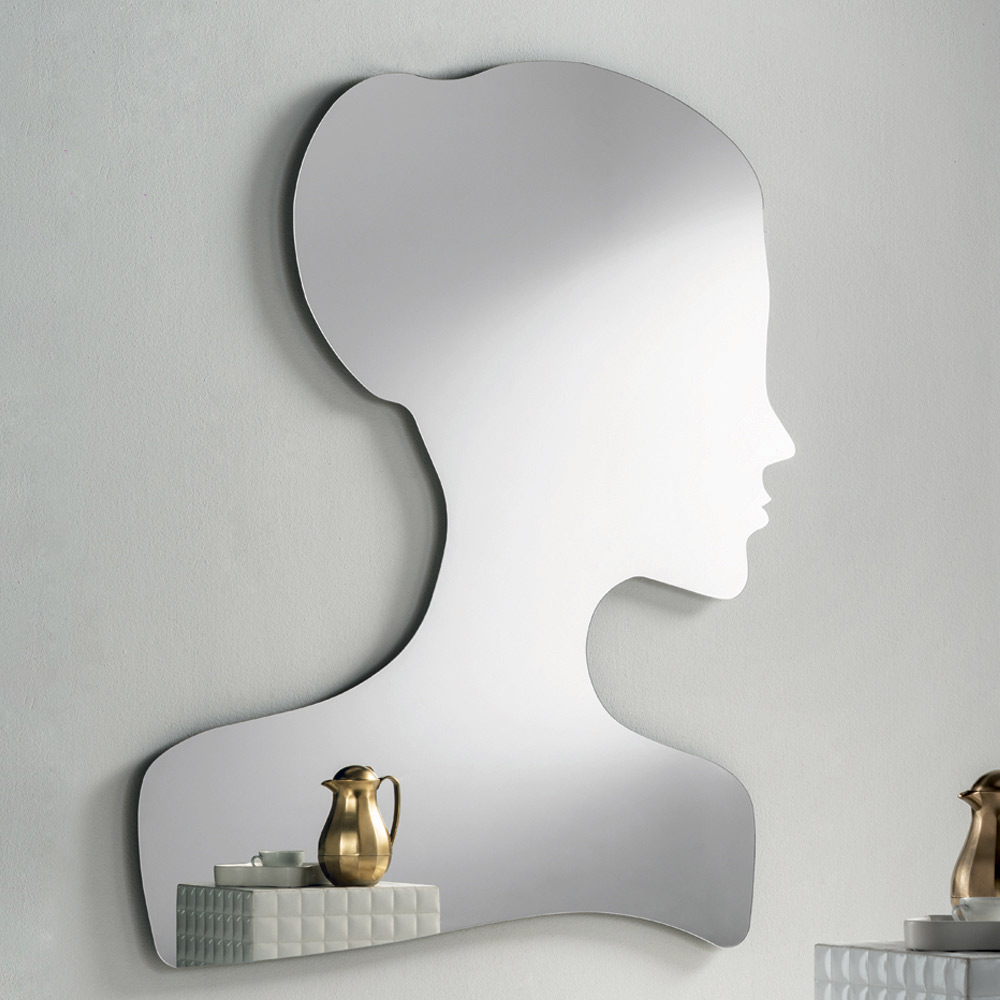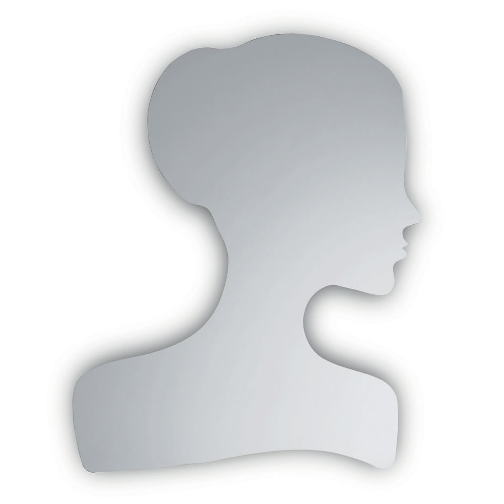 La sagoma dello specchio riproduce il profilo stilizzato di un volto femminile, caratterizzato da un chignon raccolto, un collo slanciato e spalle scoperte. Questa silhouette delicata crea una presenza elegante e scenografica, trasformando lo specchio in un elemento d’arredo dal forte impatto visivo.