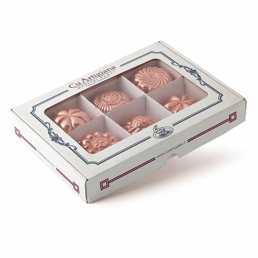 Stampi per dolci in rame stagnato a mano decorazioni varie con anello in ottone, 6 pezzi made in Italy.