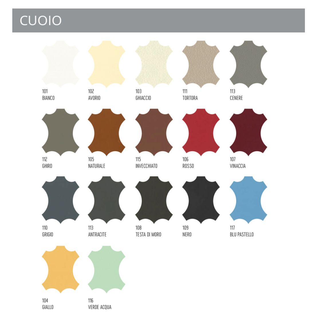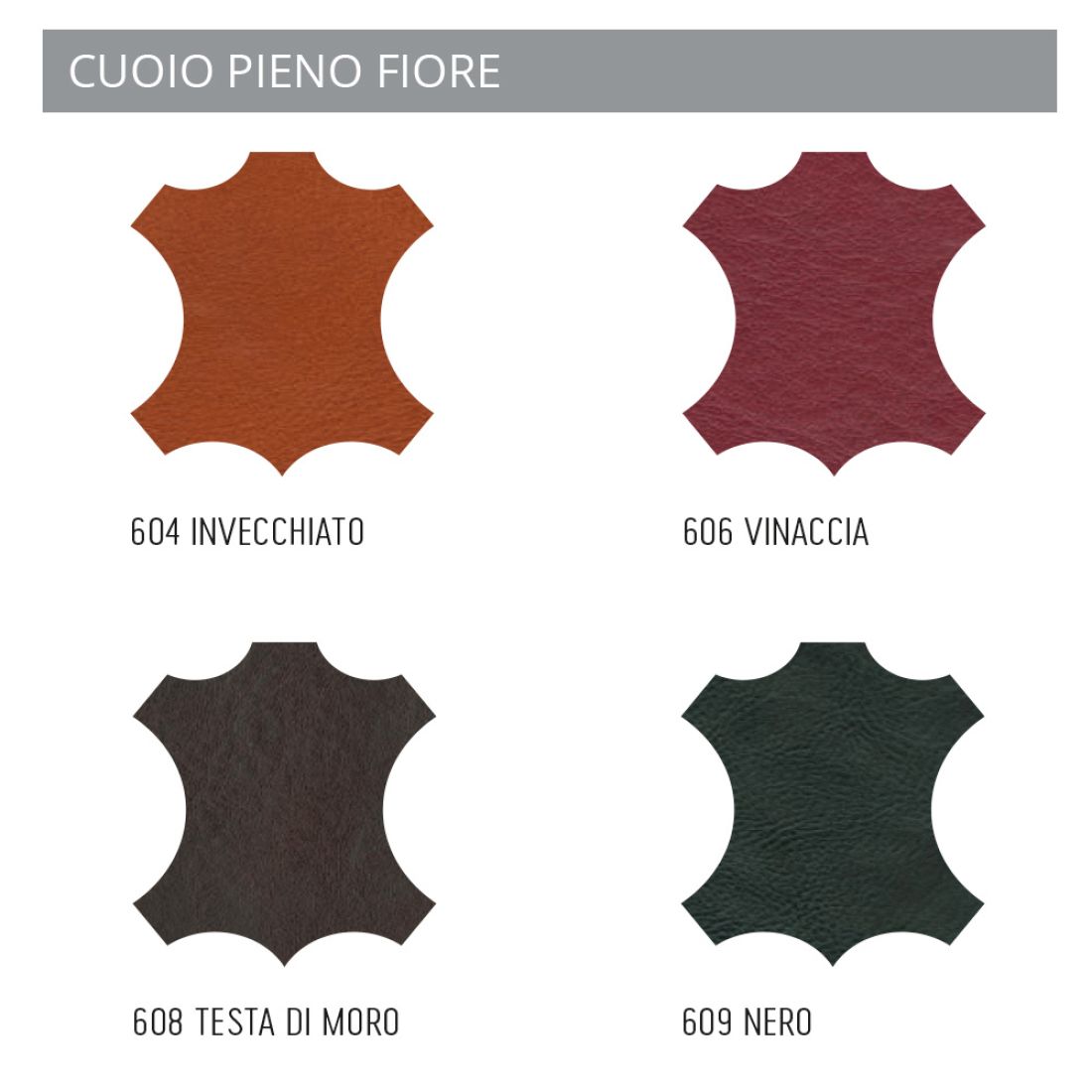 Cuoio pieno fiore naturale: il cuoio pieno fiore al naturale è un materiale privo di ogni colorazione. Evidenzia la sua naturalezza per venature, segni e ombreggiature che in armonia tra loro diventano dei pregi nel susseguirsi del tempo. Estremamente fotosensibile, parte da una colorazione rosa chiaro per arrivare a un rossiccio intenso come il Cognac. Evitare la luce diretta, teme umidità e liquidi.