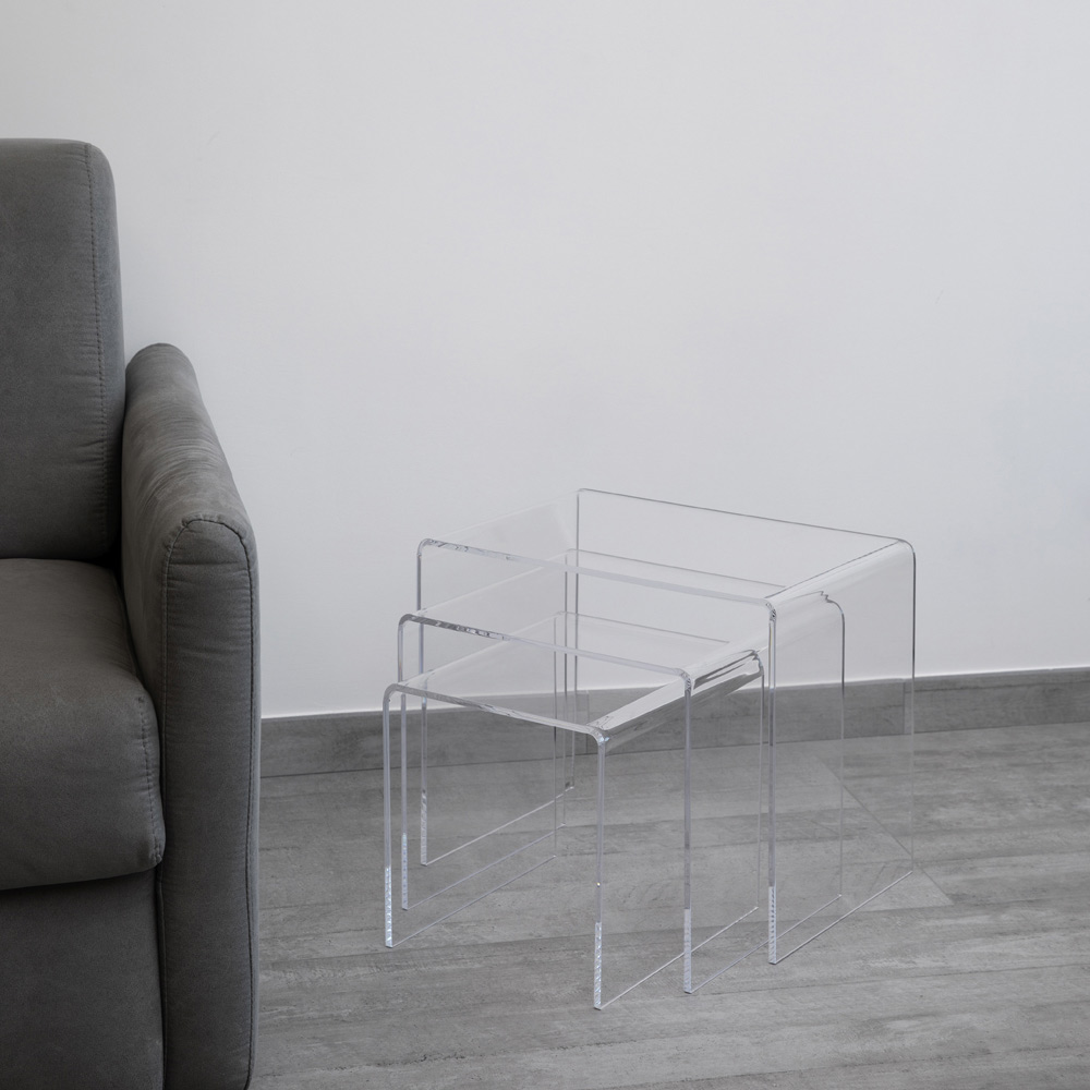 Trittico tavolini da salotto in cristallo acrilico trasparente, made in Italy.