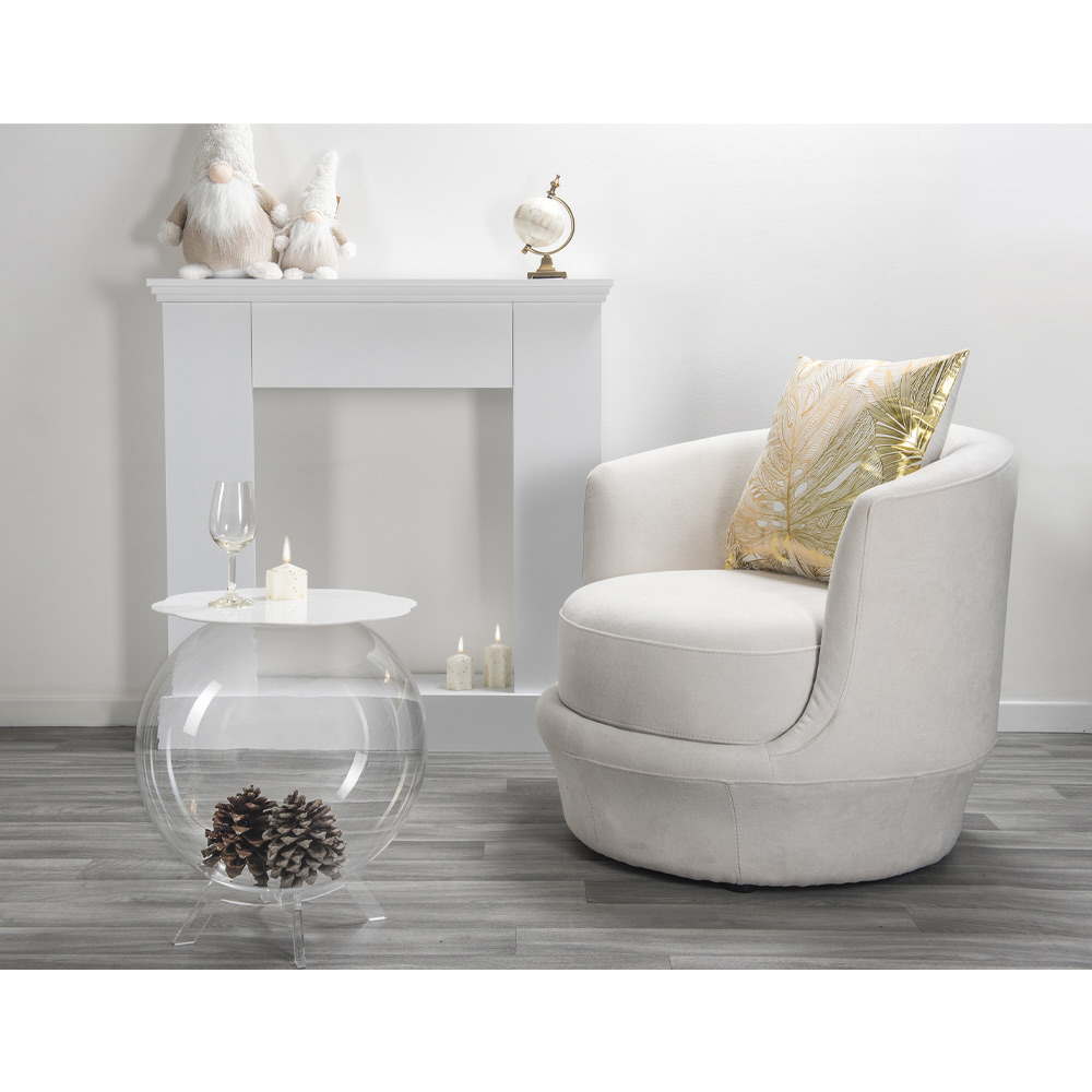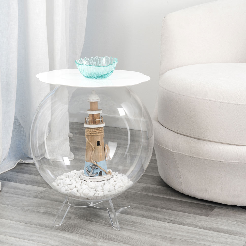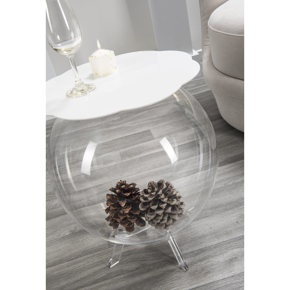 Tavolino/contenitore in plexiglass dalla struttura sferica utilizzabile come vaso per composizioni floreali, come acquario, come contenitore di giocattoli o come portabiancheria. La trasparenza del tavolo BIFFY lo rende un pezzo dal design discreto, facilmente collocabile nell'ambiente domestico. Il ripiano è in plexiglass PMMA 100% da polimero vergine di colore bianco. Il plexiglass è antiurto, indeformabile, inalterabile e termoisolante. La luminosità e la brillantezza si mantengono costanti ed inalterati nel tempo. Il plexiglass PMMA da polimero vergine utilizzato da è atossico, ipoallergico, inodore ed antibatterico. Riciclabile 100%. Pensato, progettato e realizzato in Italia, con materiali italiani.