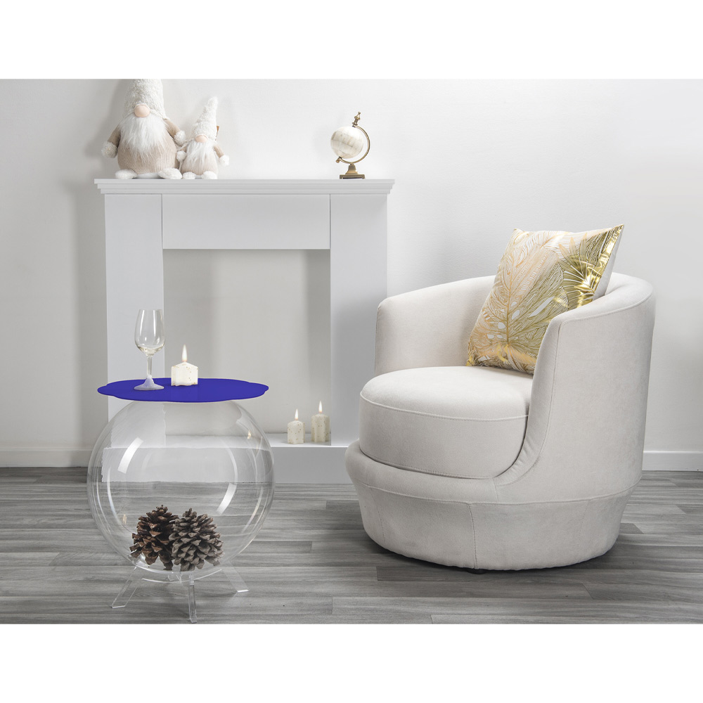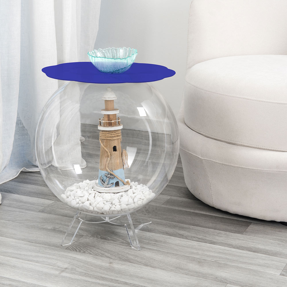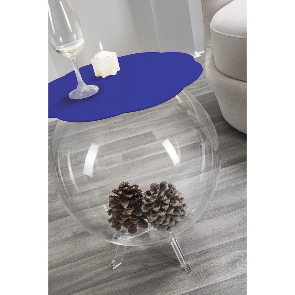 Tavolino/contenitore in plexiglass dalla struttura sferica utilizzabile come vaso per composizioni floreali, come acquario, come contenitore di giocattoli o come portabiancheria. La trasparenza del tavolo BIFFY lo rende un pezzo dal design discreto, facilmente collocabile nell'ambiente domestico. Il ripiano è in plexiglass PMMA 100% da polimero vergine di colore blu. Il plexiglass è antiurto, indeformabile, inalterabile e termoisolante. La luminosità e la brillantezza si mantengono costanti ed inalterati nel tempo. Il plexiglass PMMA da polimero vergine utilizzato da è atossico, ipoallergico, inodore ed antibatterico. Riciclabile 100%. Pensato, progettato e realizzato in Italia, con materiali italiani.