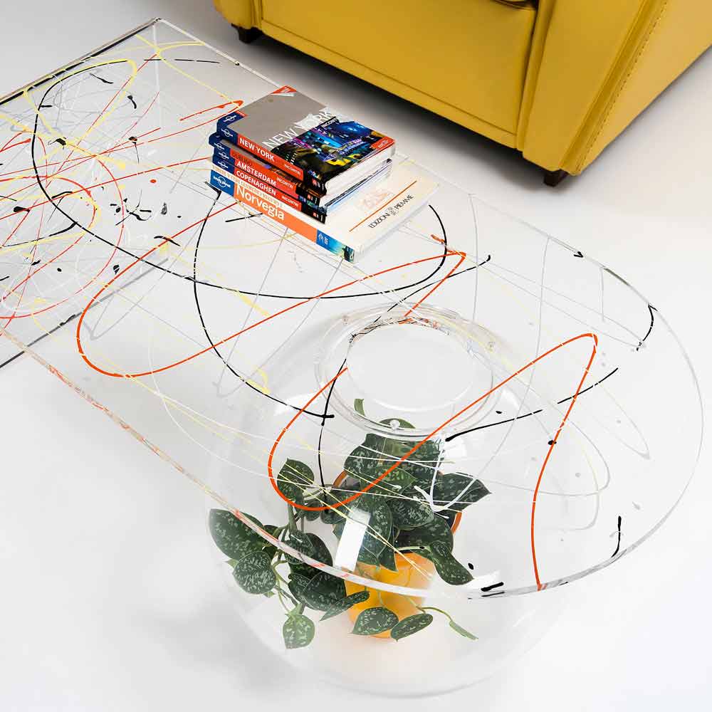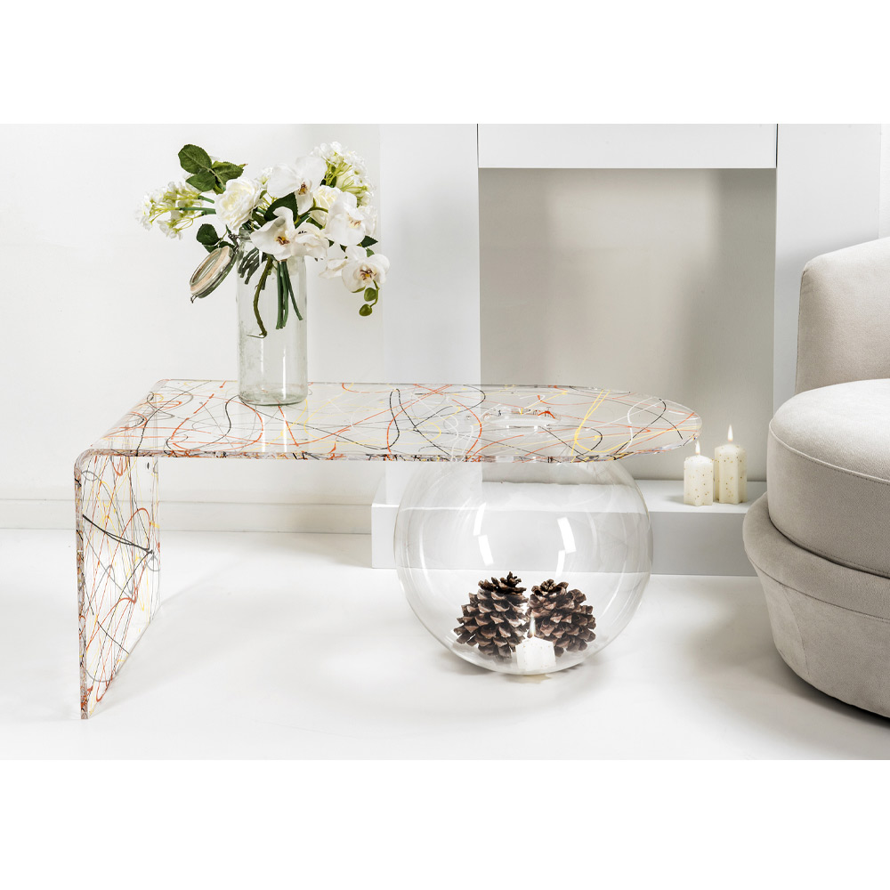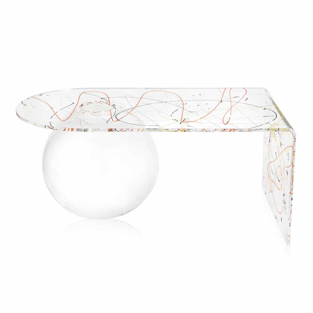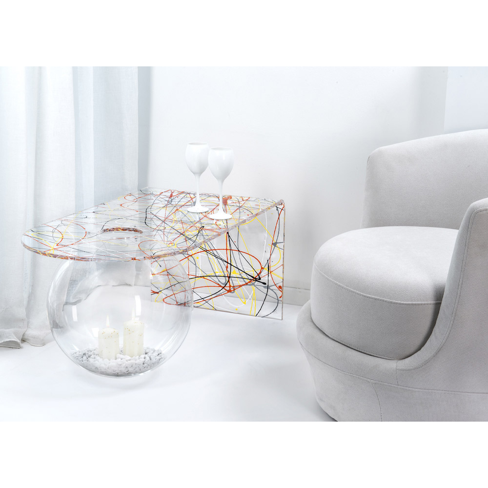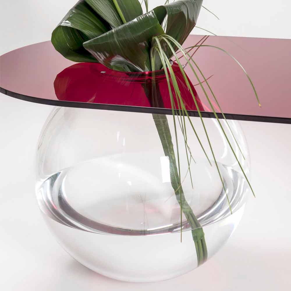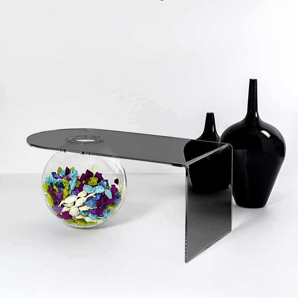 Bolly è un tavolo a ponte fabbricato artigianalmente in Italia in plexiglass PMMA da polimero vergine 100%, tagliato al laser, termoformato ad alte temperature ed assemblato ad una struttura sferica utilizzabile come vaso per i fiori, come acquario o semplicemente come contenitore.