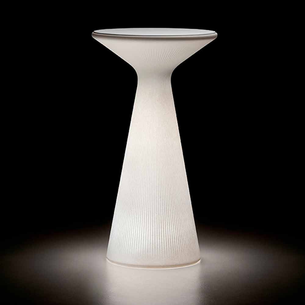 Tavolino da esterno rotondo realizzato in Italia con struttura in polietilene e piano in HPL bianco. Semplicità e funzionalità contraddistinguono questo moderno tavolino alto ideale da utilizzare come pratico piano d'appoggio ma al tempo stesso capace di ricoprire un ruolo puramente decorativo grazie al suo design innovativo e originale. La particolare superificie rigata che ricopre l'intera base del prodotto rende interessante l'estetica del tavolino, arricchito dalla luce LED RGB che, illuminando la struttura, da vita ad atmosfere ideali per trascorrere meravigliose serate in compagnia all'interno di spazi domestici come giardini e terrazze ma anche in ambienti contract in cui è necessario trovare una soluzione d'arredo tanto funzionale quanto esteticamente accattivante.
