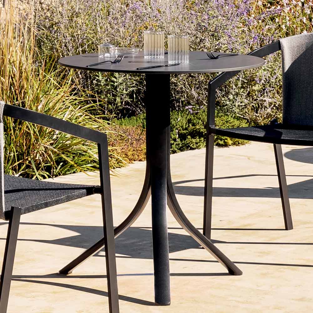 Tavolino tondo da bar per esterni dal design reclinabile in alluminio e hpl in 2 finiture, made in Italy.