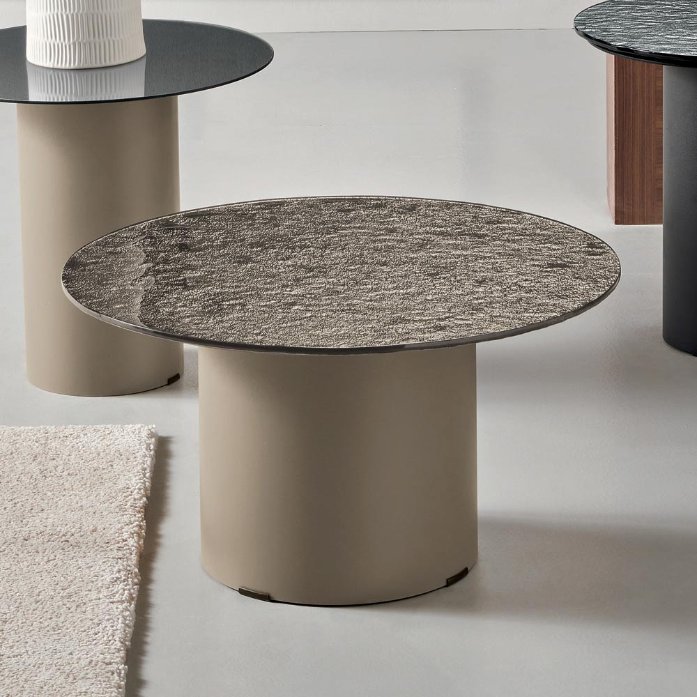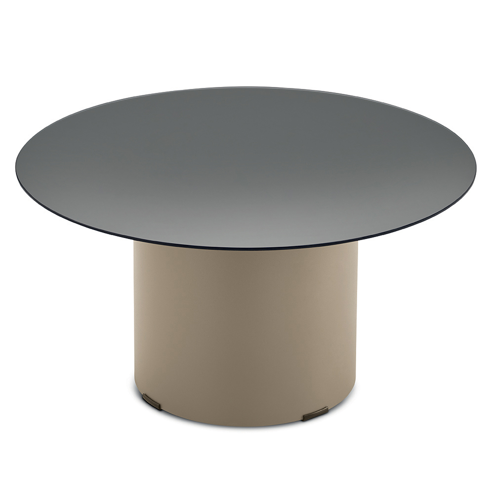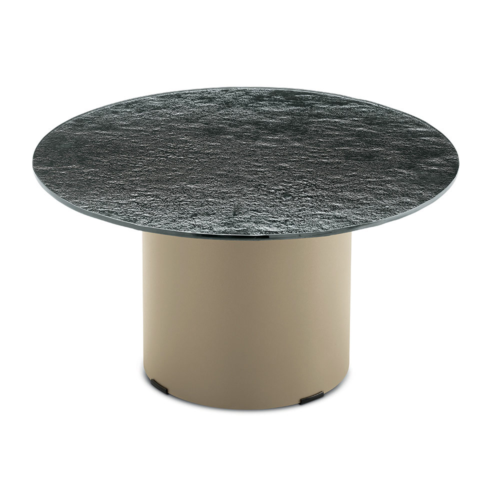La struttura è caratterizzata da una base cilindrica in metallo verniciato, solida ma visivamente leggera, che sostiene con equilibrio il piano superiore. Questo contrasto tra volumi pieni e superfici sottili crea un’estetica moderna ed elegante, perfetta per ambienti ricercati.