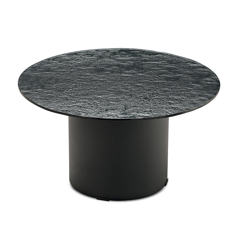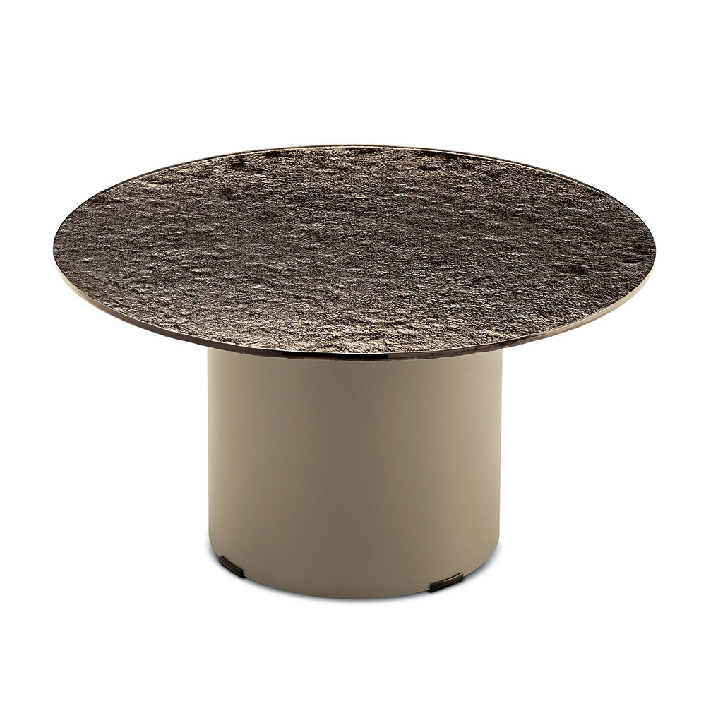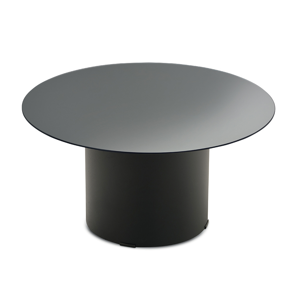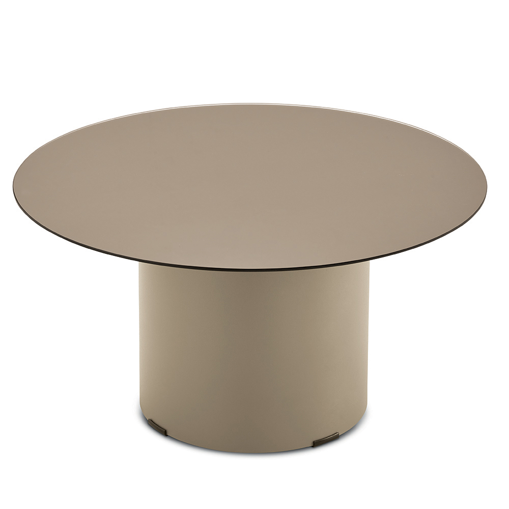 La struttura è caratterizzata da una base cilindrica in metallo verniciato, solida ma visivamente leggera, che sostiene con equilibrio il piano superiore. Questo contrasto tra volumi pieni e superfici sottili crea un’estetica moderna ed elegante, perfetta per ambienti ricercati.