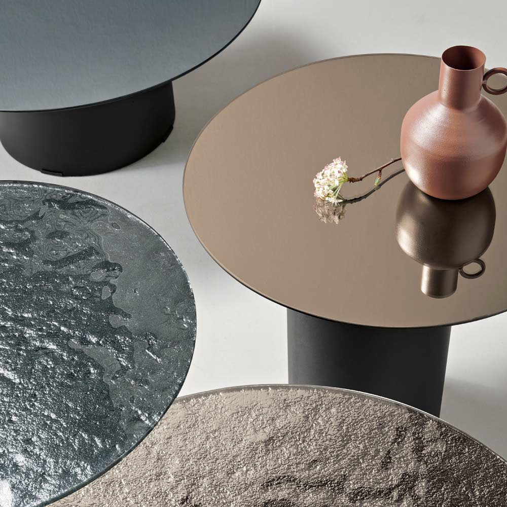 Il piano è disponibile in vetro martellato retroargentato oppure in specchio liscio, entrambe soluzioni pensate per riflettere la luce e valorizzare lo spazio con effetti visivi distintivi. La possibilità di combinare finiture e colori consente di personalizzare il tavolino secondo il proprio stile.