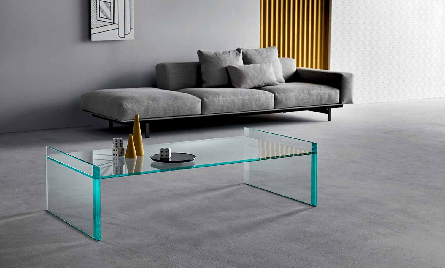 Tavolino da caffè di design moderno in vetro extrachiaro con bordi bisellati, prodotto artigianalmente in Italia.