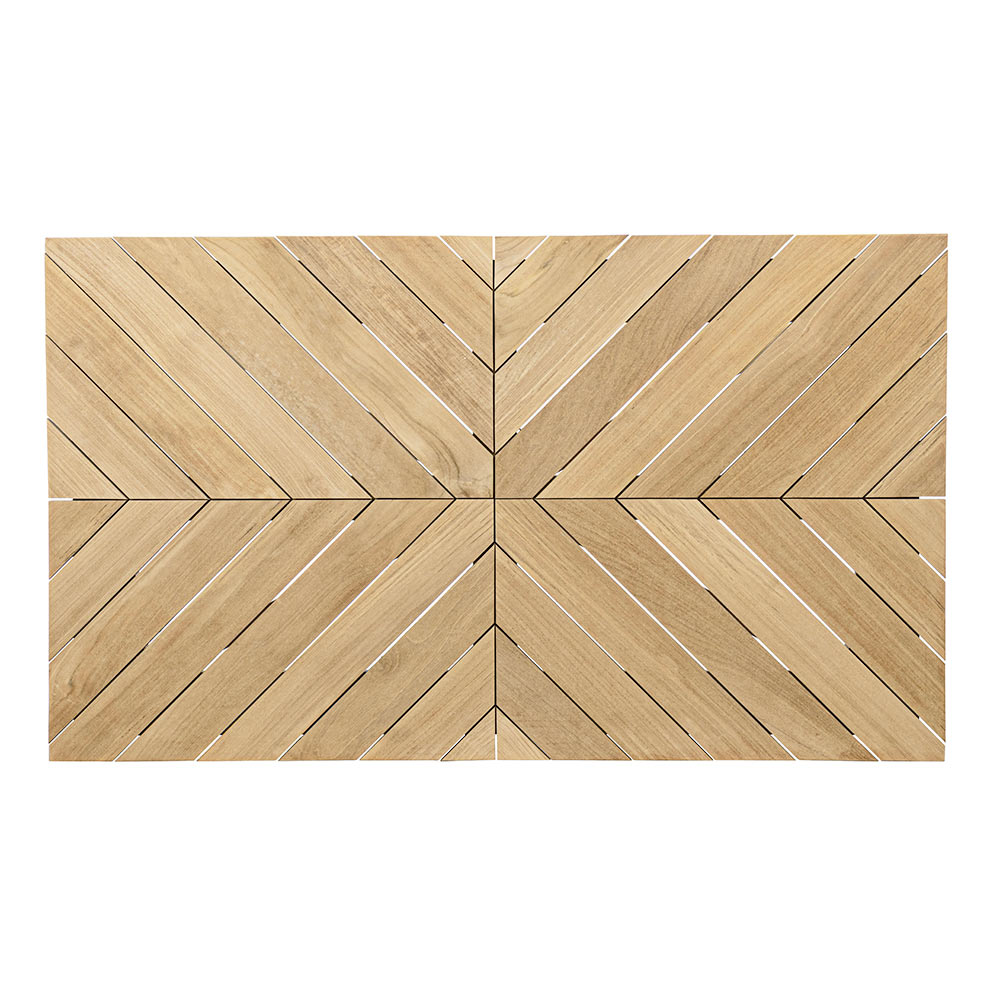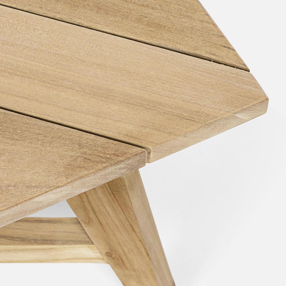 Tavolino da esterno rettangolare con piano e struttura in legno di teak.
