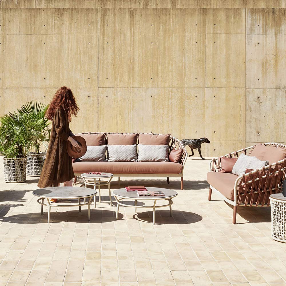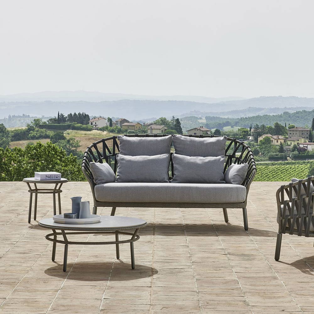 Tavolino da giardino rotondo con struttura in alluminio e intreccio in corda Made in Italy.