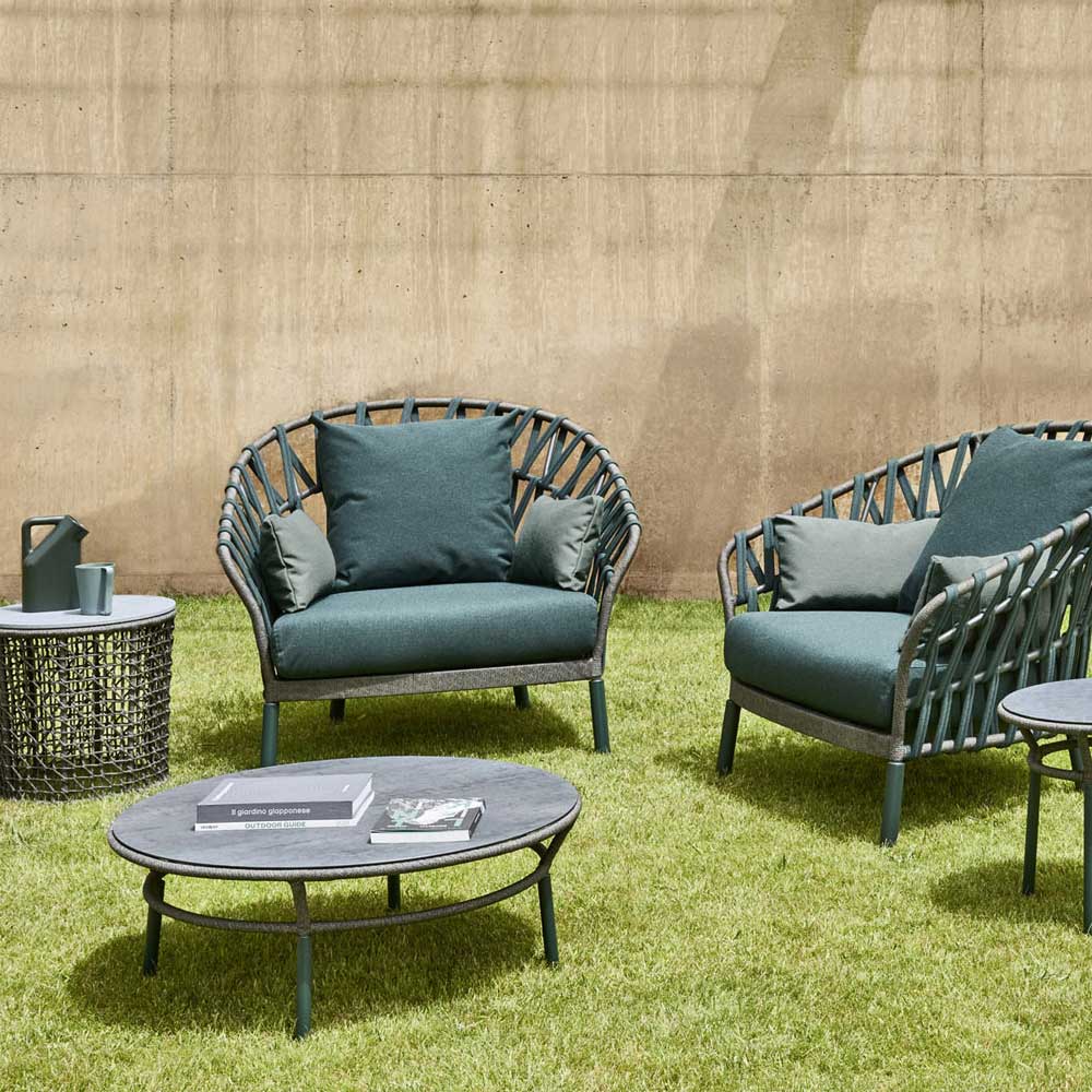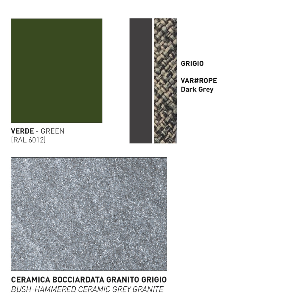 - gamba verde, intreccio VAR#ROPE dark grey, piano in ceramica bocciardata granito grigio;