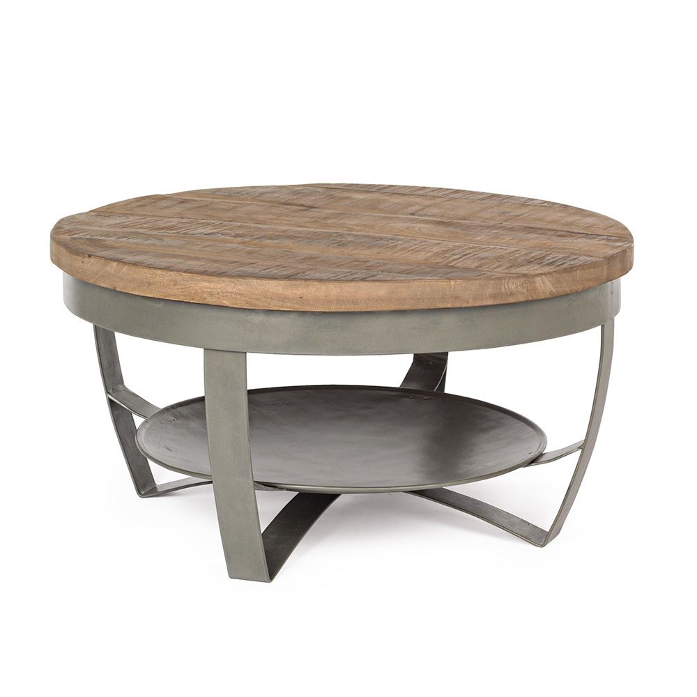 Tavolino da caffè tondo in acciaio e legno di mango di design industriale, 2 misure.