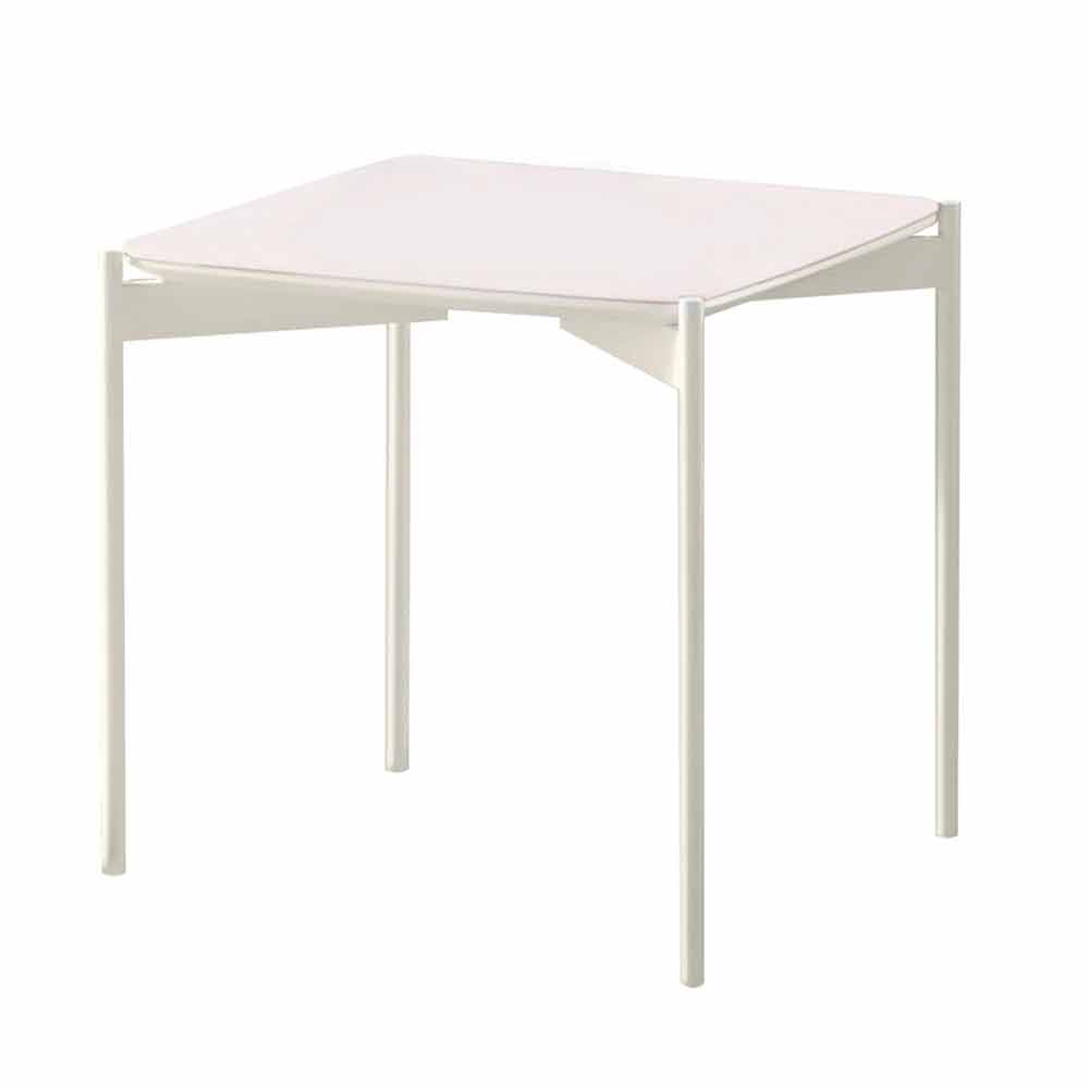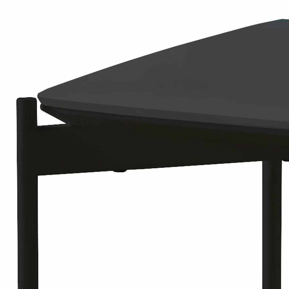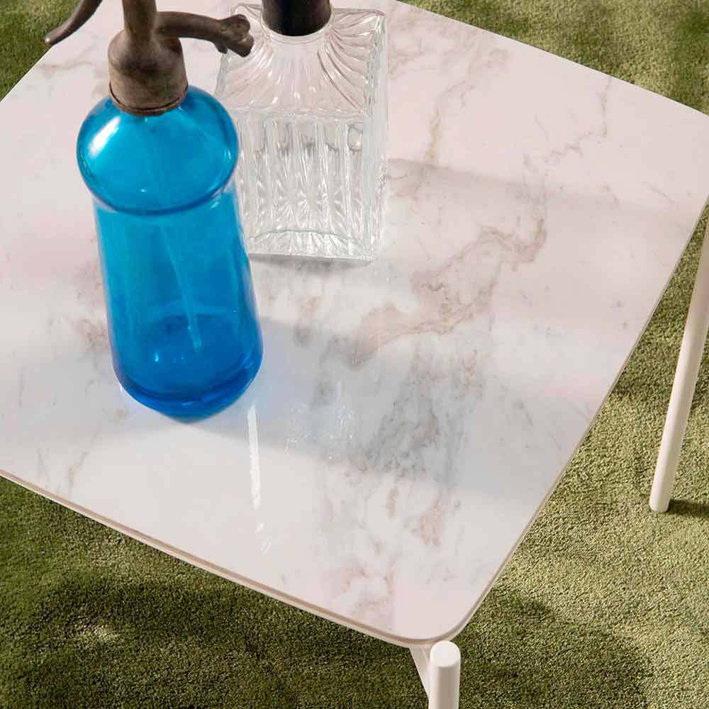 Tavolino basso da caffè di design moderno con piano in ceramica e struttura in metallo.