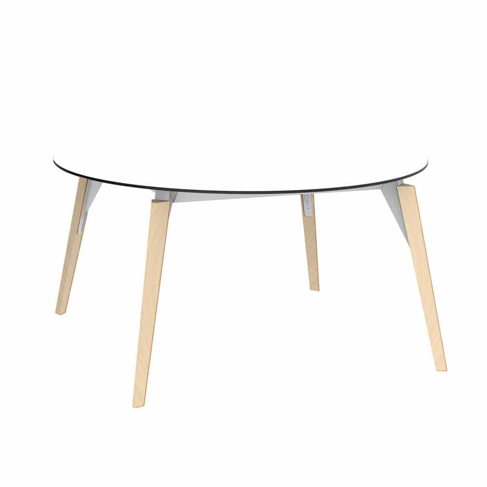 Tavolino da caffè rotondo con gambe in legno di frassino chiaro o scuro e piano in hpl di varie finiture e 2 misure.