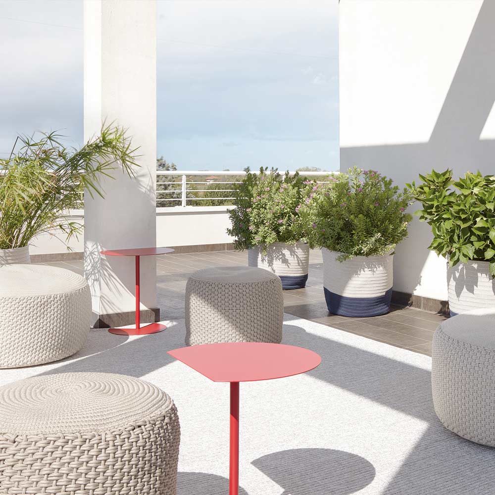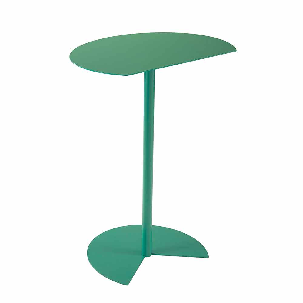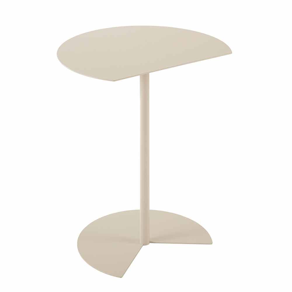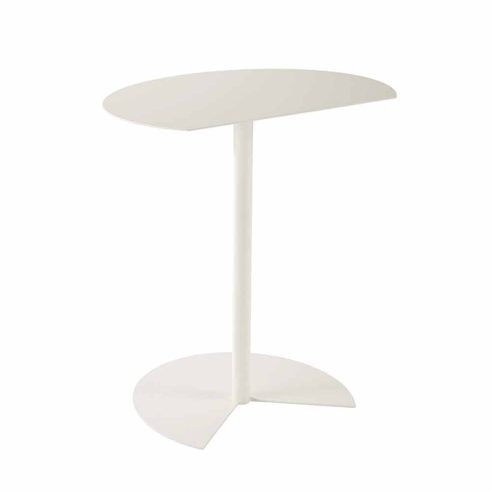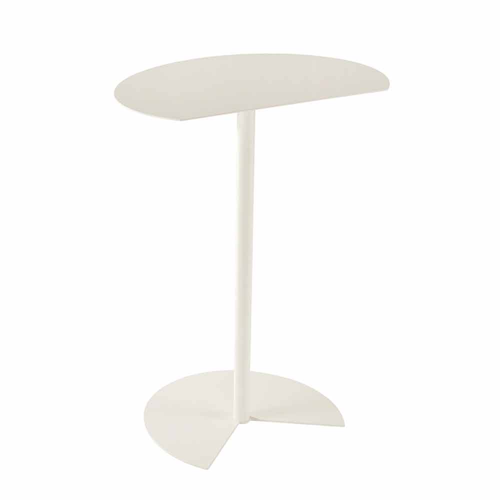 tavolino da caffè per esterno si caratterizza per il piano d'appoggio che richiama la rotondità del cerchio spezzata da un taglio netto così da poter essere collocato attaccato a un muro, per ottimizzare lo spazio, oppure per essere accoppiato ad un suo simile, per un