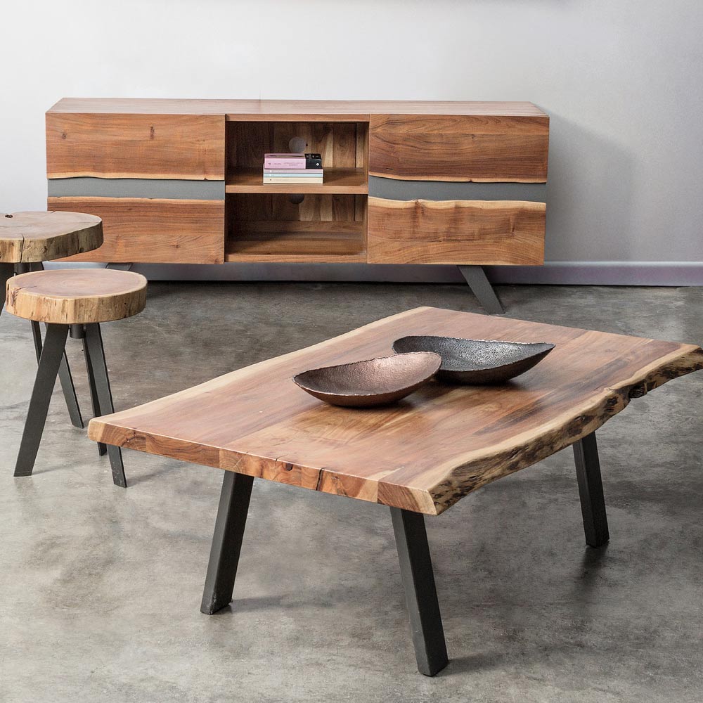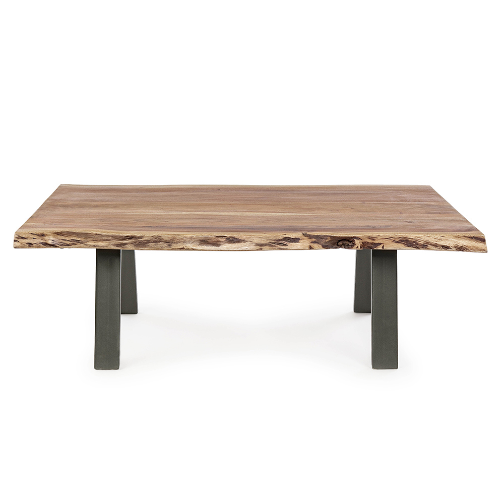 Tavolino da caffè in legno di acacia lavorato a mano e gambe in acciaio.
