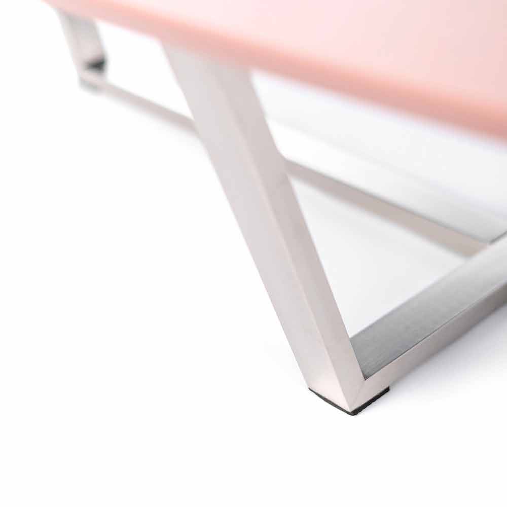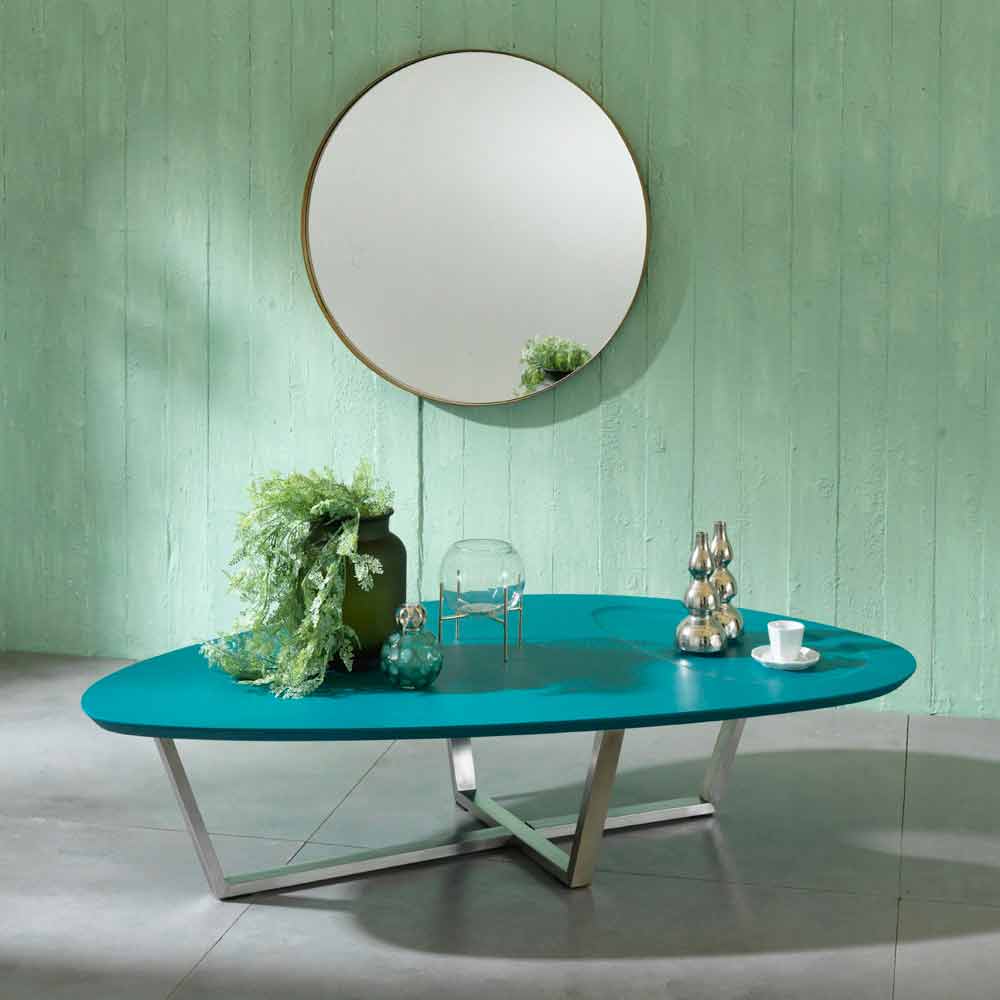 Tavolino da salotto sagomato di design moderno con piano in mdf e base in metallo cromato.
