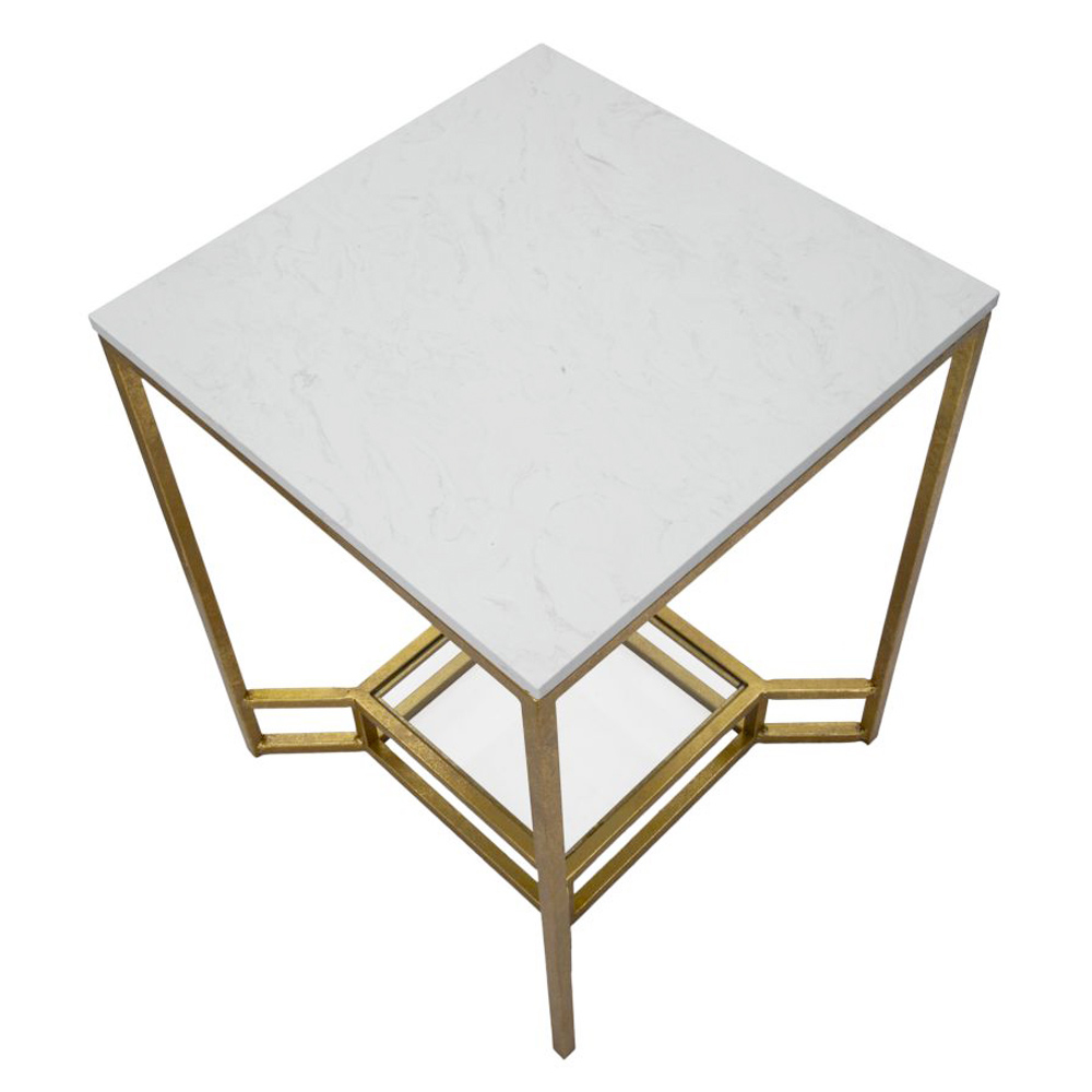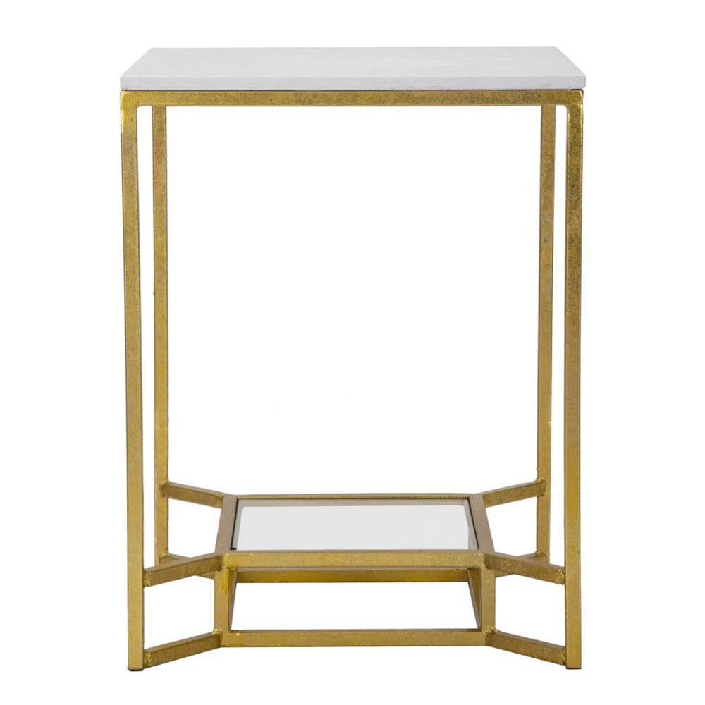 Tavolno da salotto con struttura in ferro finitura dorata arricchita da un inserto in vetro e piano in resina effetto marmo bianco. Un complemento che coniuga in sè eleganza e funzionalità per un risultato ottimale capace di fungere da pratico piano d'appoggio e al tempo stesso da originale elemento decorativo per la zona living. Il suo design è scandito da linee geometriche semplici che lo rendono particolarmente versatile e ideale perciò per completare con personalità salotti dallo stile raffinato per un'arredamento esclusivo e ricercato.
