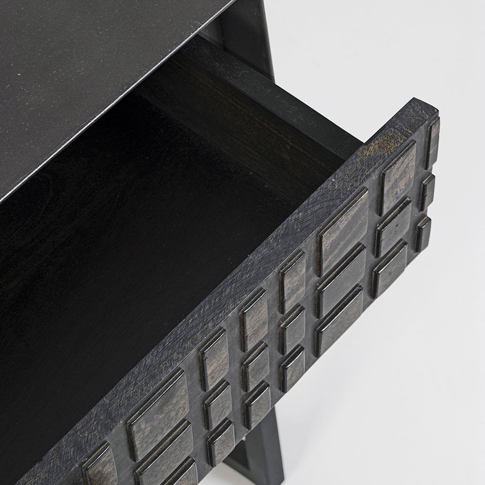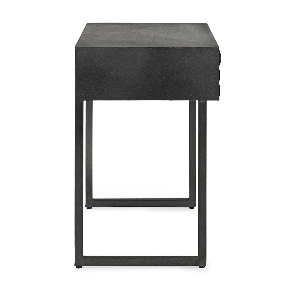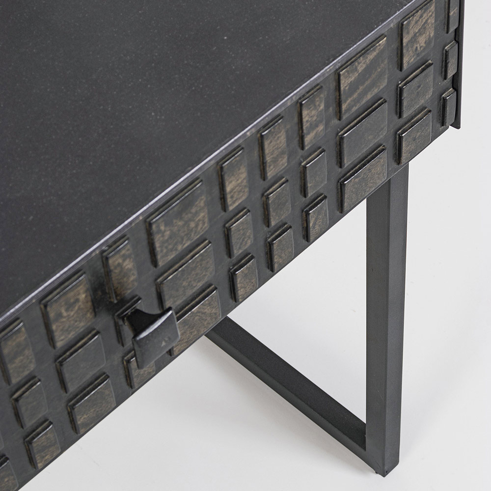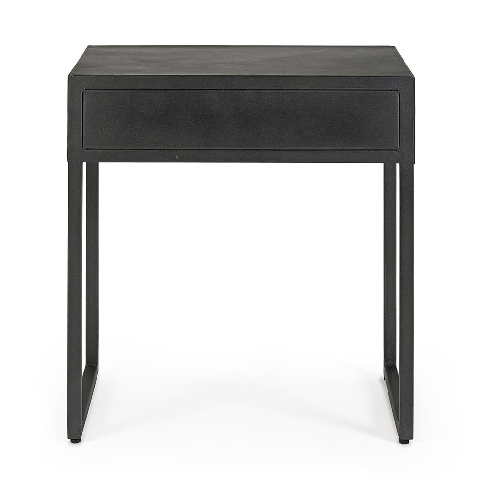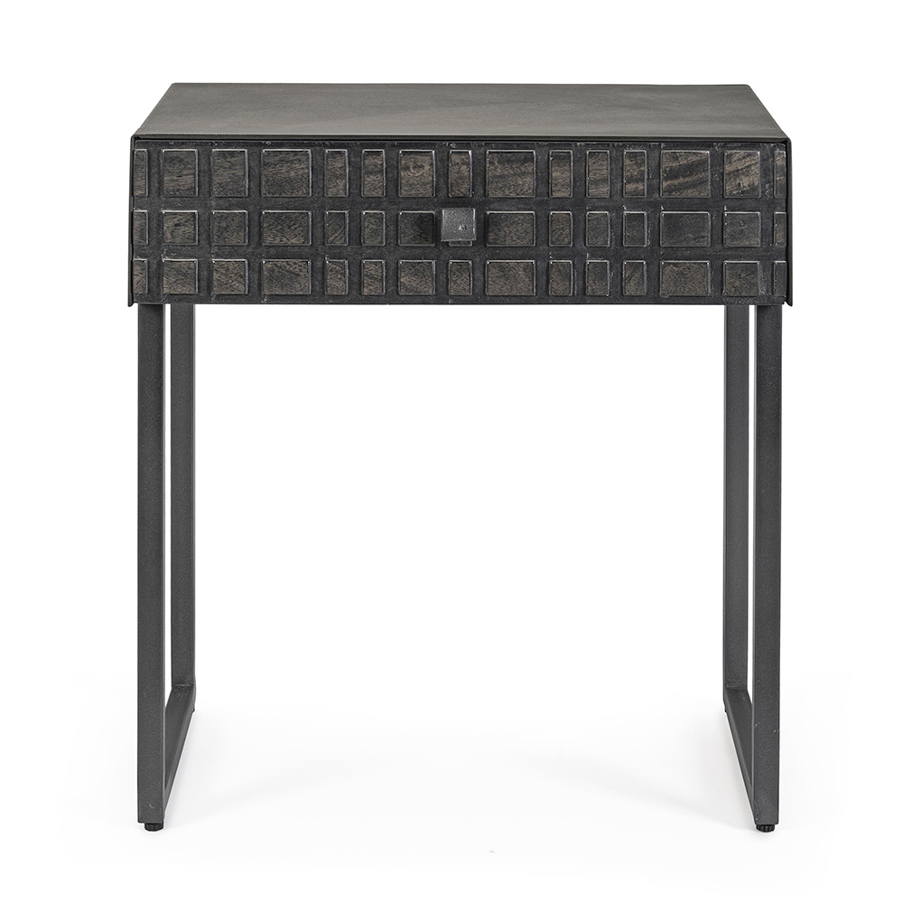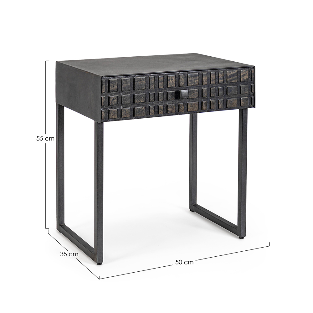 Tavolino comodino in acciaio con cassetto in legno di mango di design etnico.