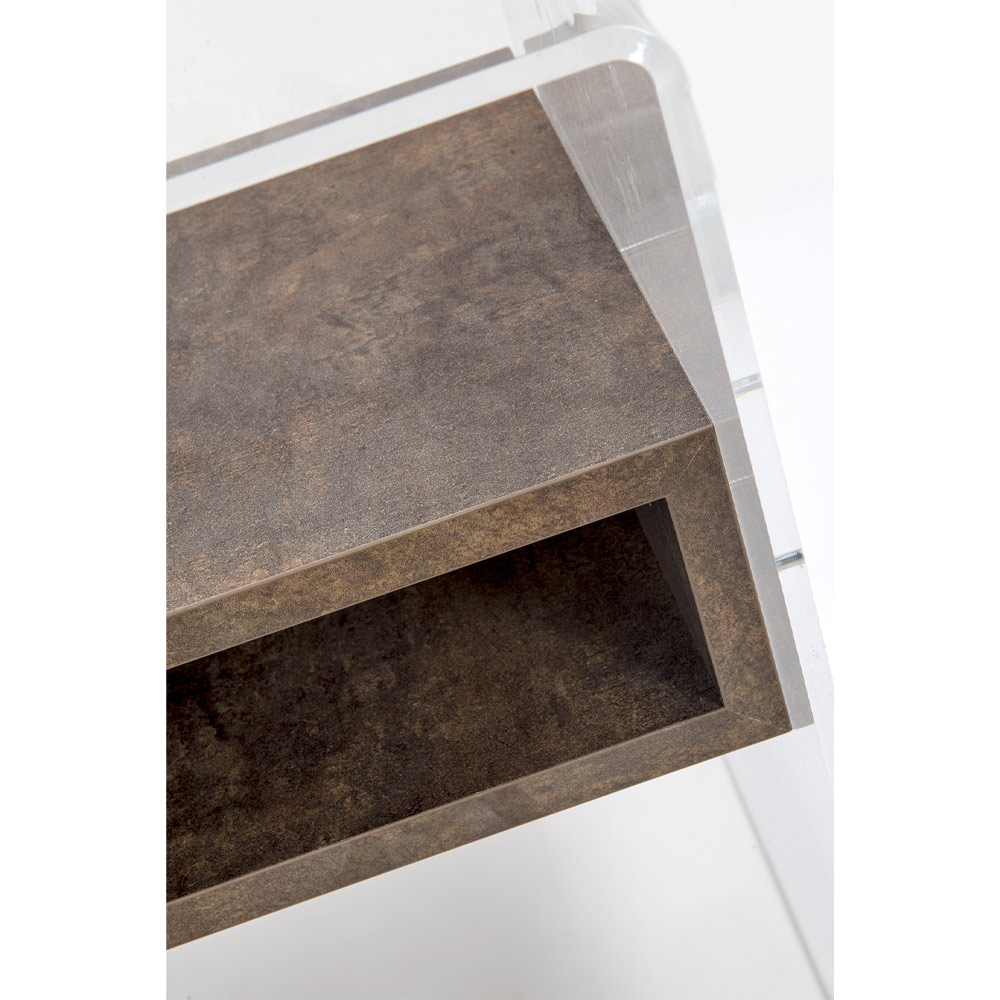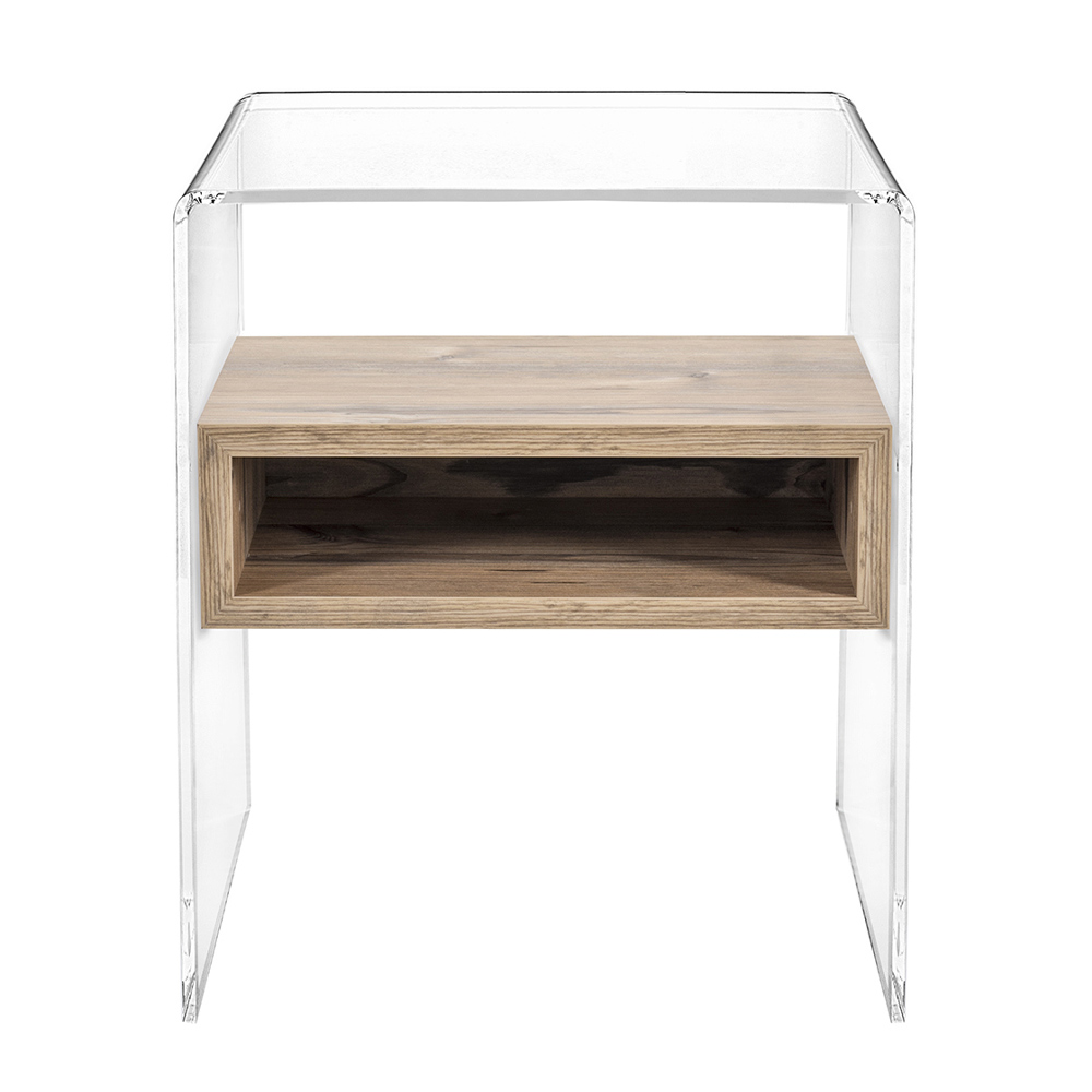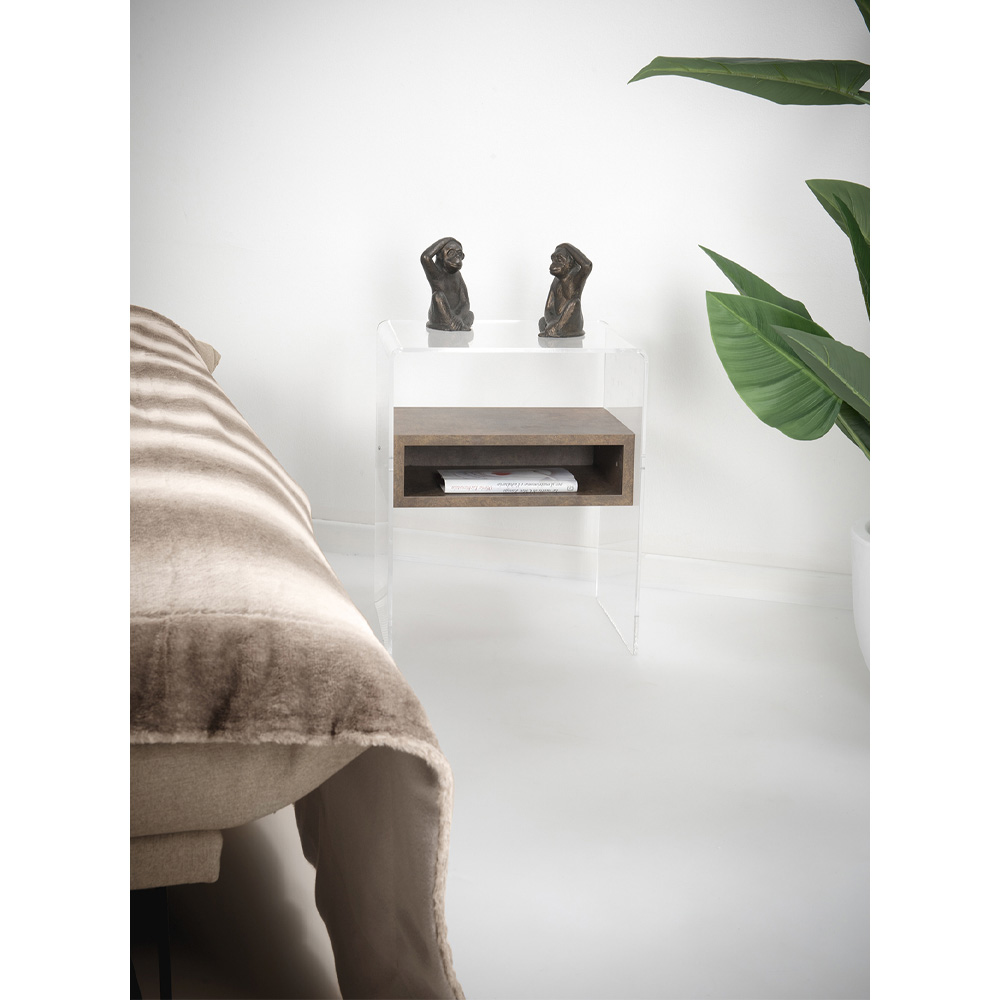 Comodino o tavolino in plexiglass trasparente ed essenze legnose made in Italy.