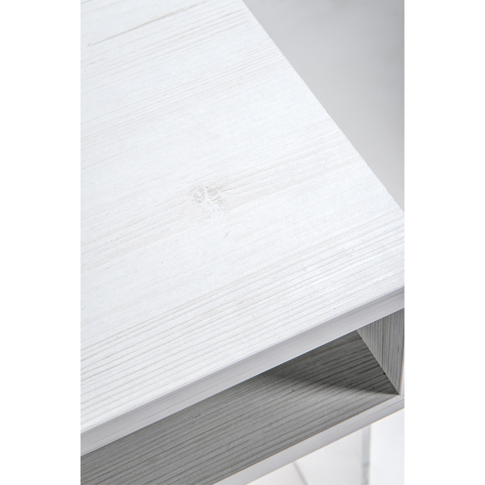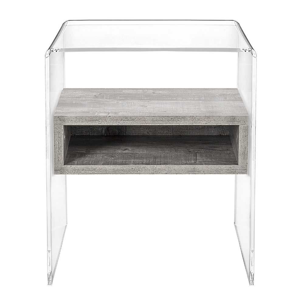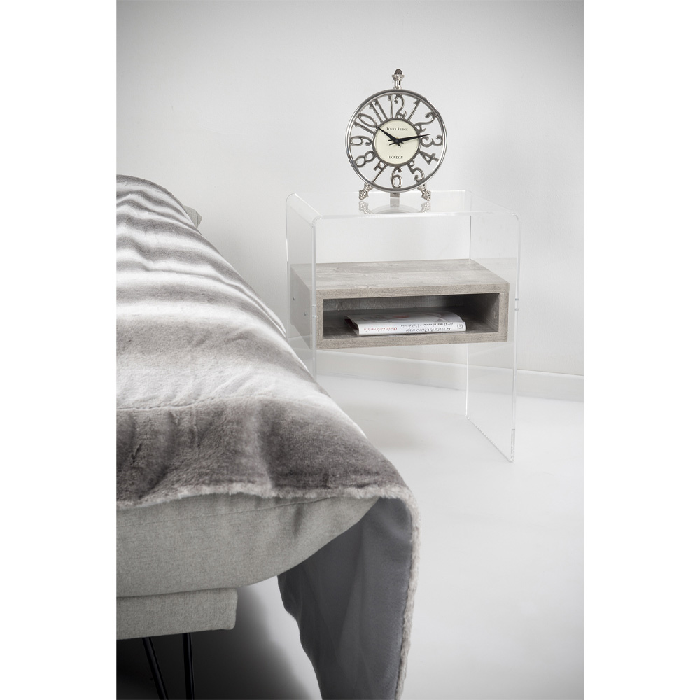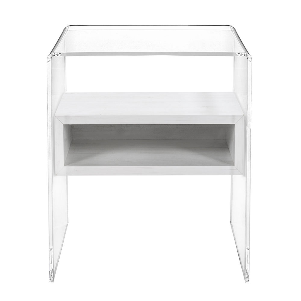 Comodino o tavolino in plexiglass trasparente ed essenze legnose made in Italy.