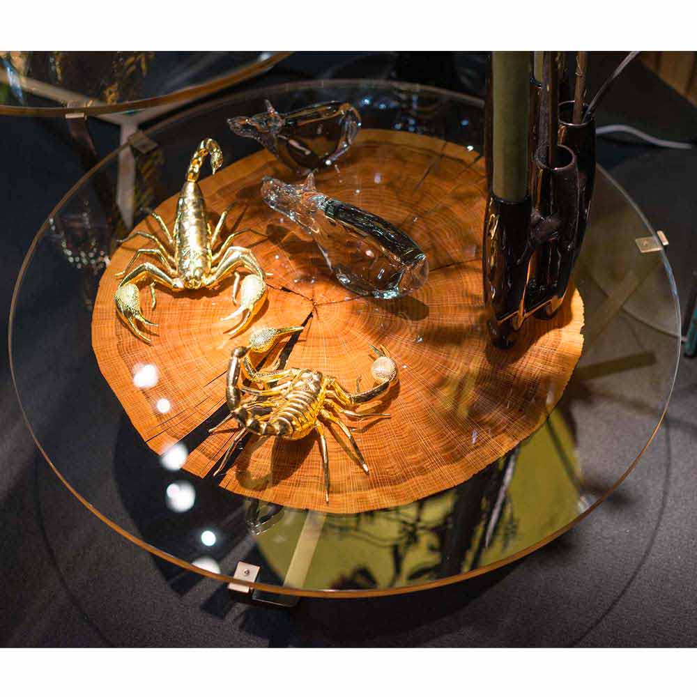 Il piano è composto da due strati di vetro accoppiato 5+5 cm contenenti una sezione di legno tranciato di testa, sostenuto da gambe in ottone brunito spazzolato.