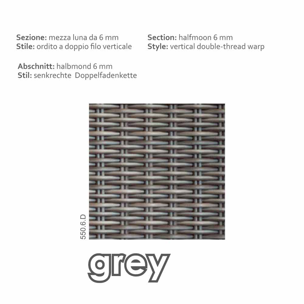Mark è costituito da un telaio in alluminio e una struttura completamente in polietilene half moon di grande qualità, nella finitura grigio - taupe da 6 mm, completamente intrecciato a mano.