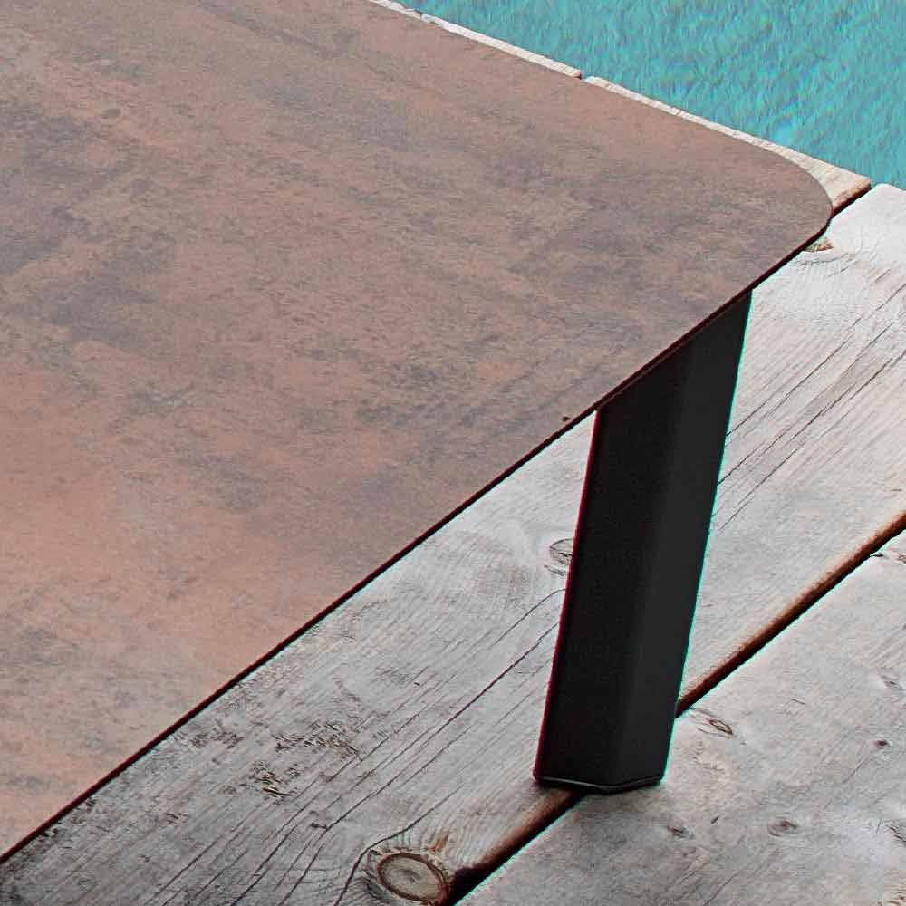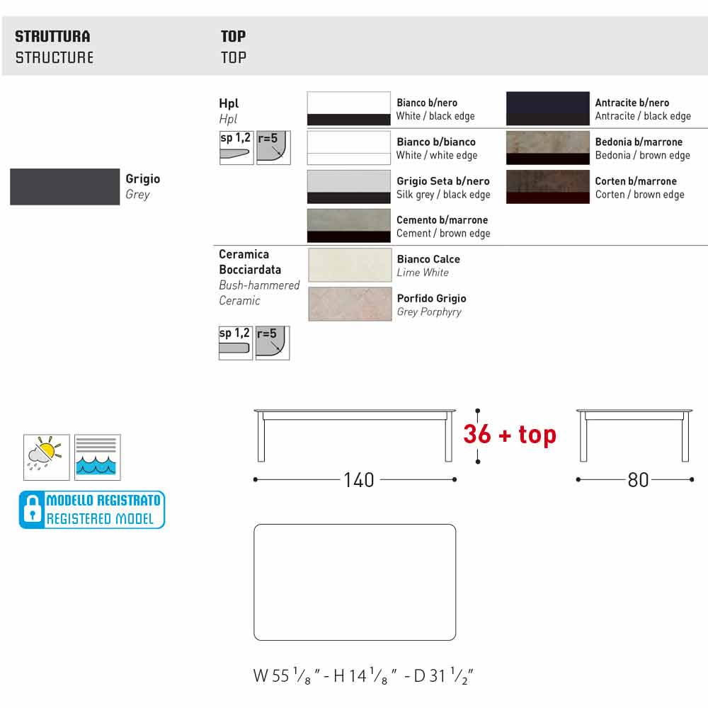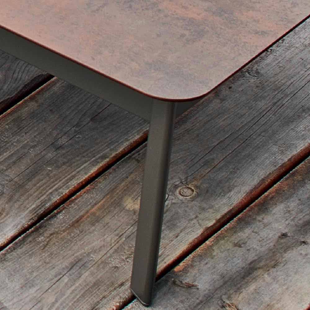 System è un elegante tavolino da giardino con una struttura in alluminio verniciato a polveri grigio; con top in HPL (sp 1,2) in finitura: grigio setab/nero, bianco b/nero, antracite b/nero, bianco b/bianco, cemento b/marrone, bedonia b/marrone, corten b/marrone; o con top in ceramica bocciardata (sp 1,2) in finitura: bianco calce e porfido grigio.