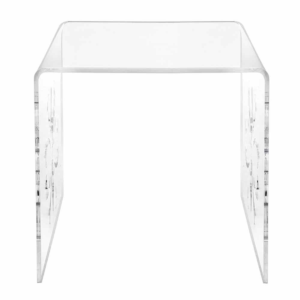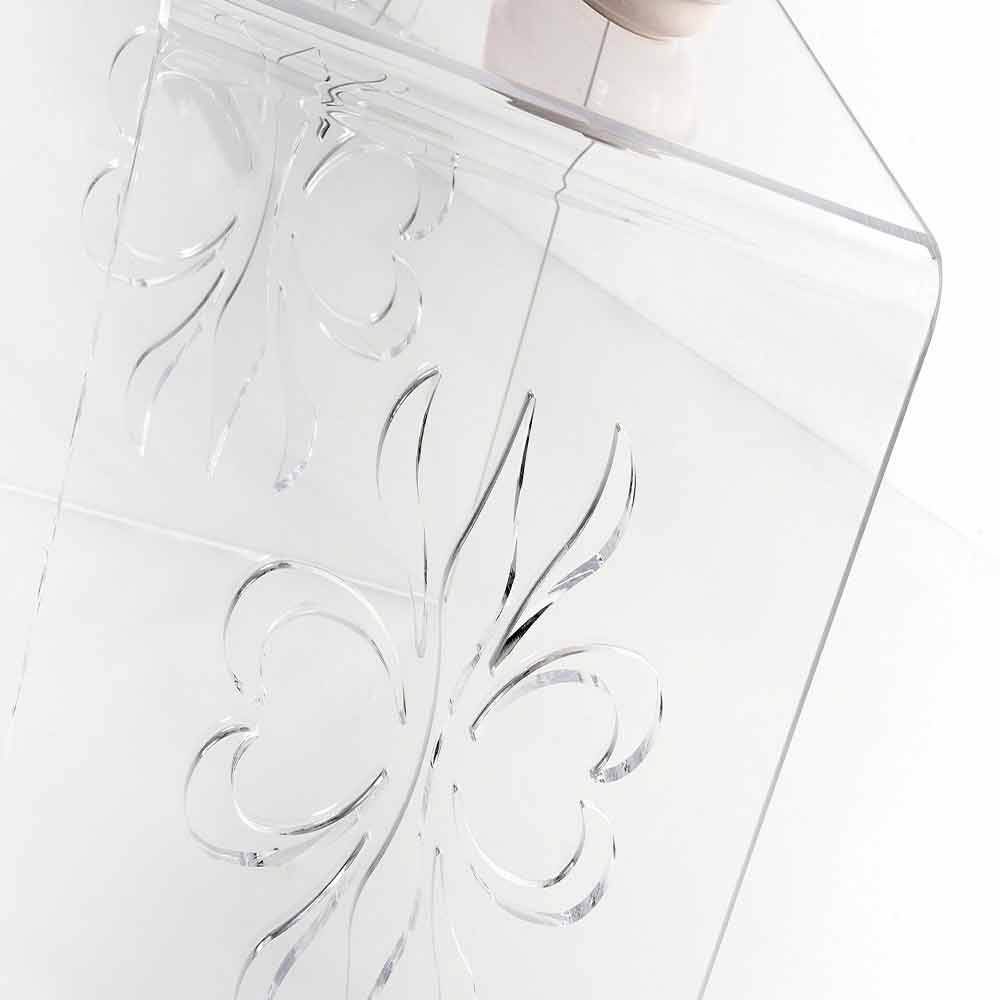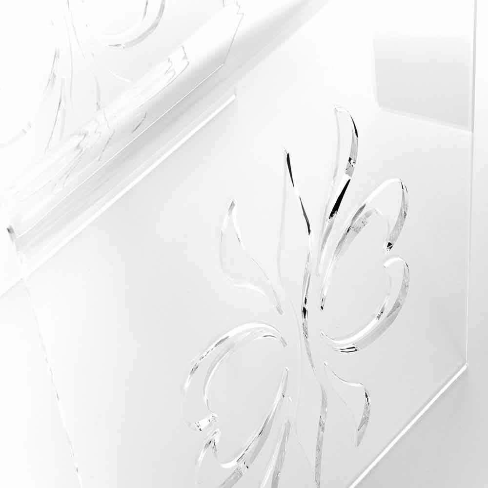 Mandas è un tavolino ralizzato in purissimo cristallo acrilico, impreziosito da intarsi laterali sapientemente realizzati con la precisione del taglio laser. L'elevata qualità del materiale e lo spessore del tavolo ne esaltano la brillantezza. Ideale come fronte divano, è una presenza discreta e raffinata in ogni ambiente, sia classico sia moderno.