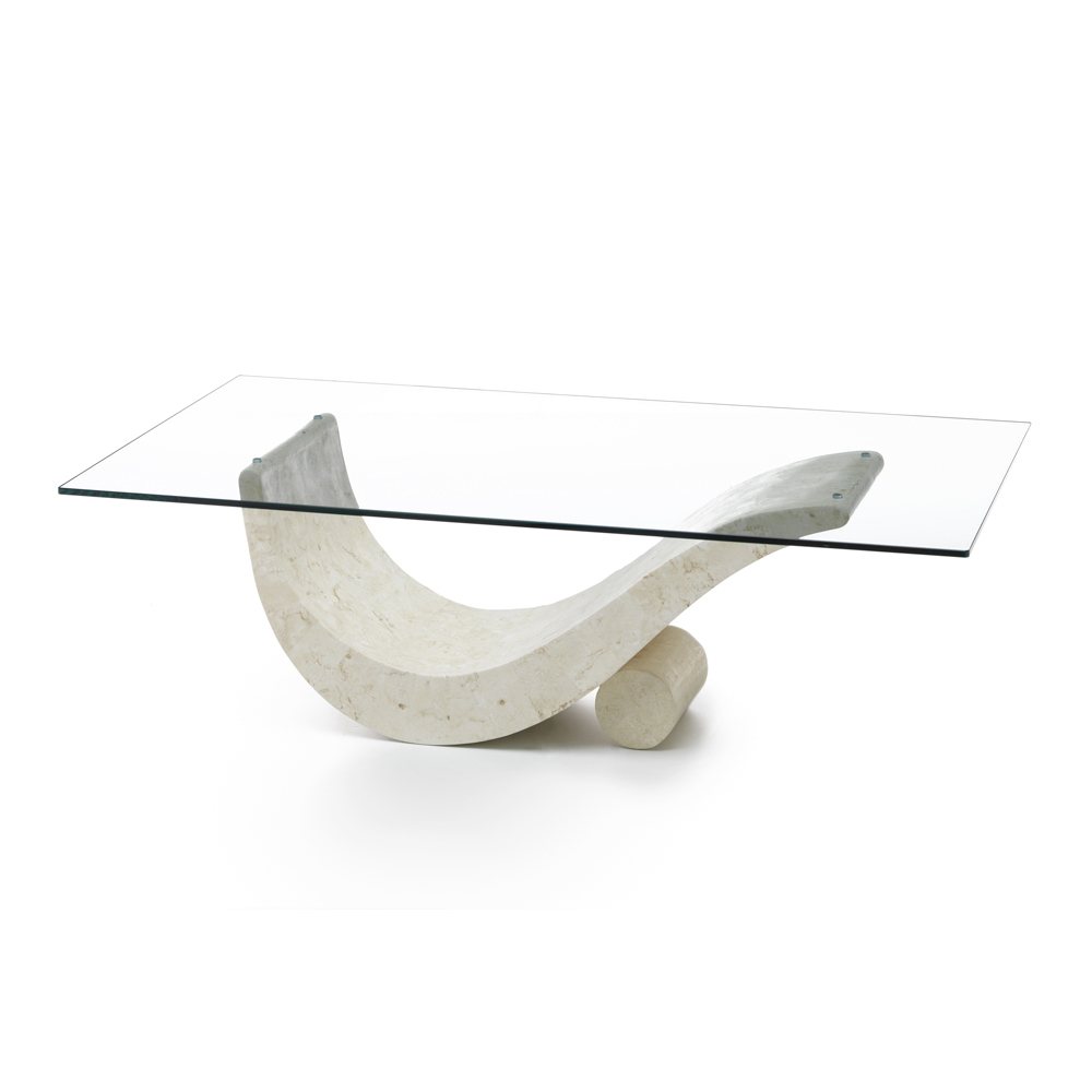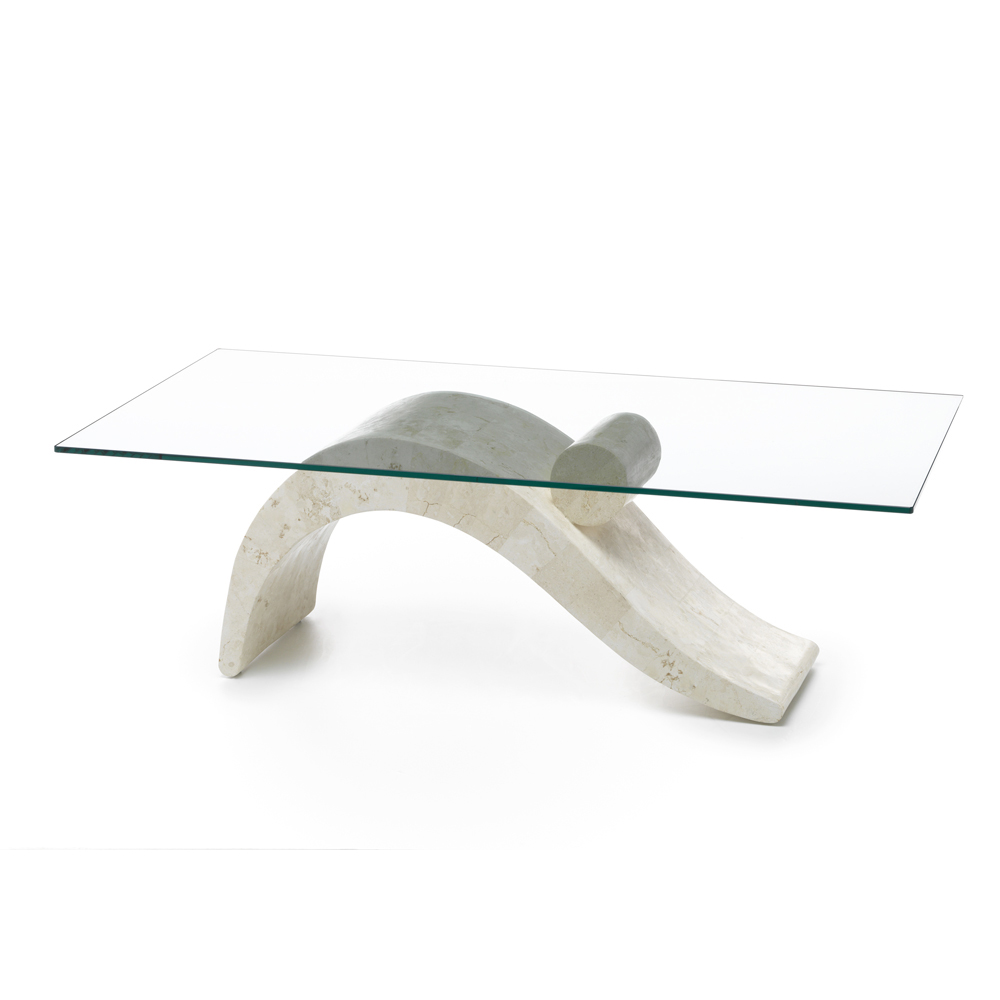 Presenta una struttura realizzata in fossil stone finitura white agata e un piano in vetro temperato 10mm filo lucido trasparente.