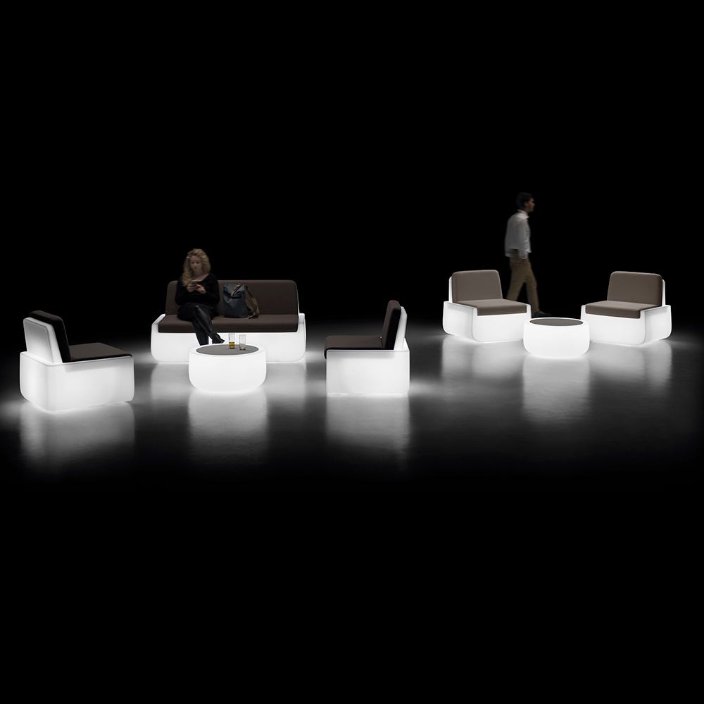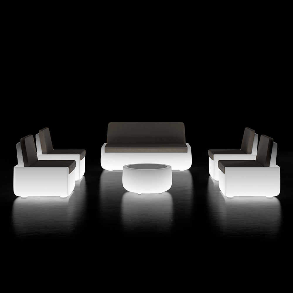 Tavolino basso da esterno di design in polietilene con piano in hpl e luce LED Made in Italy.