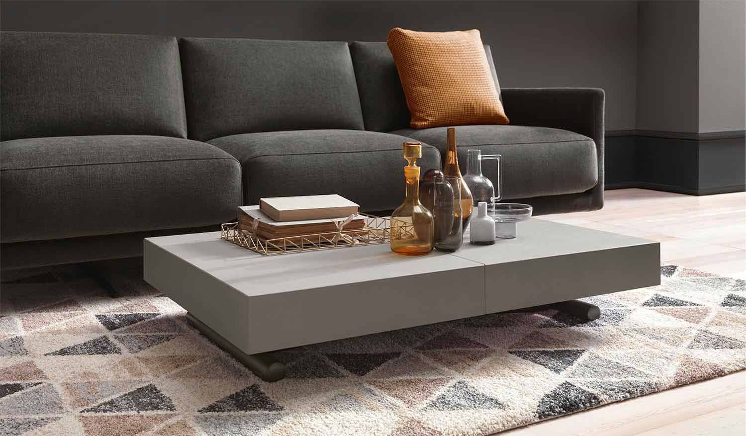 tavolino trasformabile è delineato da linee raffinate e minimali in grado di arredare con eleganza e praticità i tuoi ambienti domestici e contract.