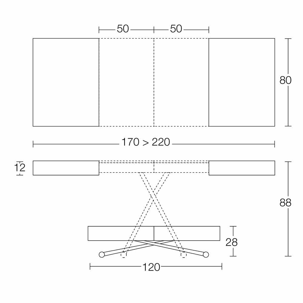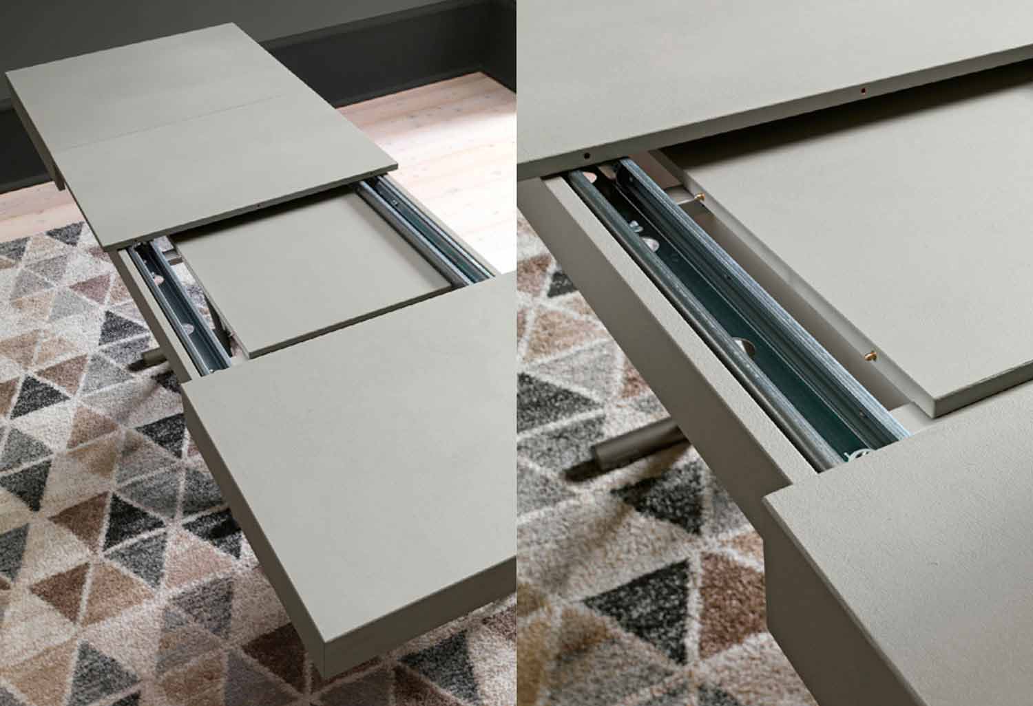Il piano è rettangolare allungabile attraverso 2 prolunghe interne da 50 cm ciascuna.